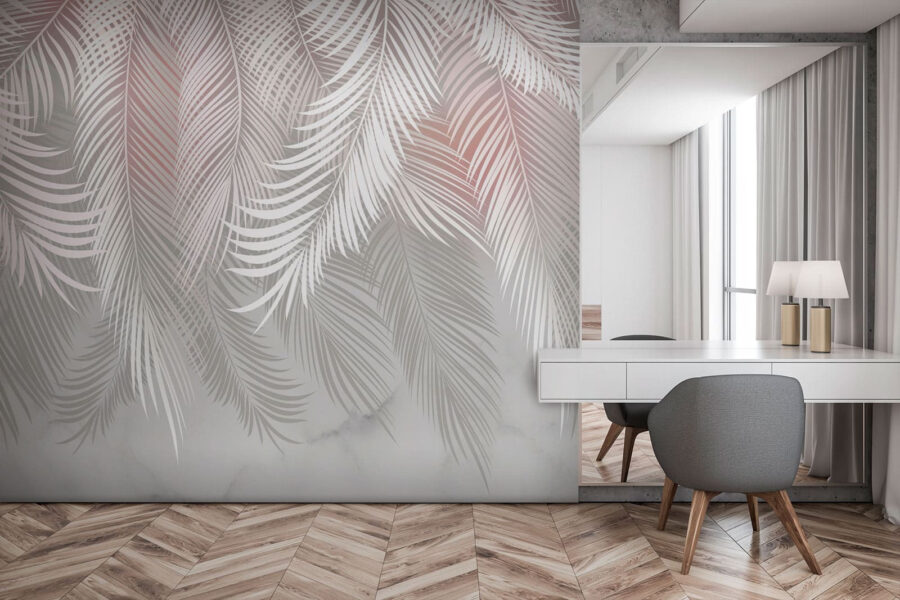 Sziasztok! Nézd meg ezt a lenyűgöző falfestményt, melynek címe “Elegáns mintázatú tollak hullámzanak”. Olyan, mintha a természet úgy döntött volna, hogy elegáns partit rendez a nappalidban. Tollas pálmalevelek sodródnak lefelé egy nyugodt, mégis kifinomult dizájnban. Képzeld el, hogy minden nap erre a békés hangulatra ébredsz. A finom részletek szinte arra késztetnek, hogy kinyújtsd a kezed és megérintsd őket – puha és szellős, tudod?