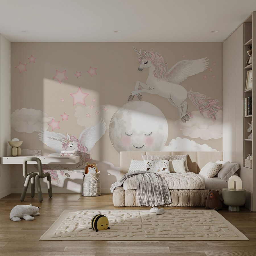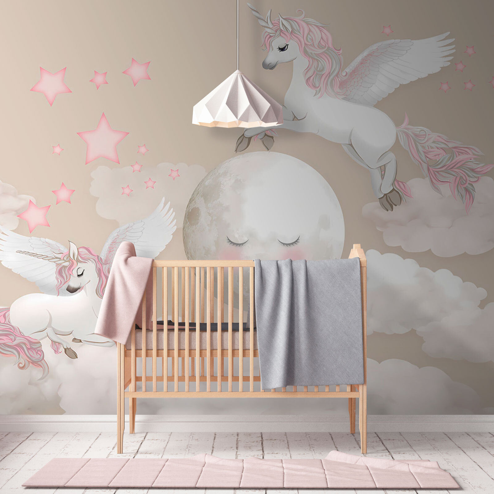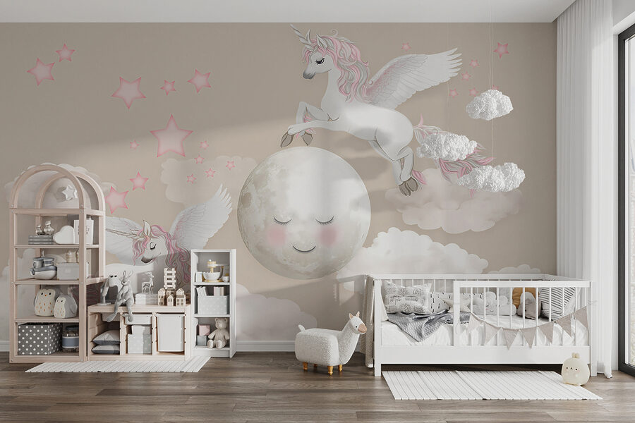 Képzelje el: a gyerekszobája egy szeszélyes álomországgá változik ezzel az imádnivaló “Szárnyas és szarvú egyszarvú” falfestménnyel. Tele van pelyhes felhőkkel, csillogó csillagokkal és a legaranyosabb, legvarázslatosabb egyszarvúakkal, akik körbe-körbe repkednek. Az egész hangulat lágy, álomszerű, és egyszerűen tökéletes arra, hogy beindítsa a kicsik fantáziáját. Képzeld el az esti meséket ezeknek az elvarázsolt egyszarvúaknak a szelíd tekintete alatt – minden este olyan érzés lesz, mintha egy távoli mesebeli királyságba utaznál. Olyan, mintha egy darab varázslat lenne a falon, amely újra és újra az öröm és a csoda pillanatait teremti meg.