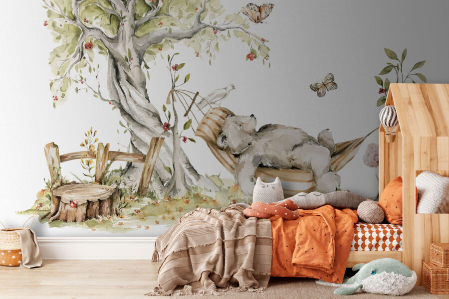 Hát nem ez a legaranyosabb? Képzeld el ezt a falfestményt, “Medve álmodozik a békés függőágyban”, a kisgyermeked szobájában – beszéljünk egy álomszerű menekülésről! Képzelj el egy hangulatos medvét, amint egy szeszélyes fa alatt egy függőágyban heverészik, miközben pillangók röpködnek mellette. Olyan, mint egy jelenet egy meséből, tökéletes a varázslatos hangulat megteremtéséhez a gyerekszobában vagy a játszótéren.