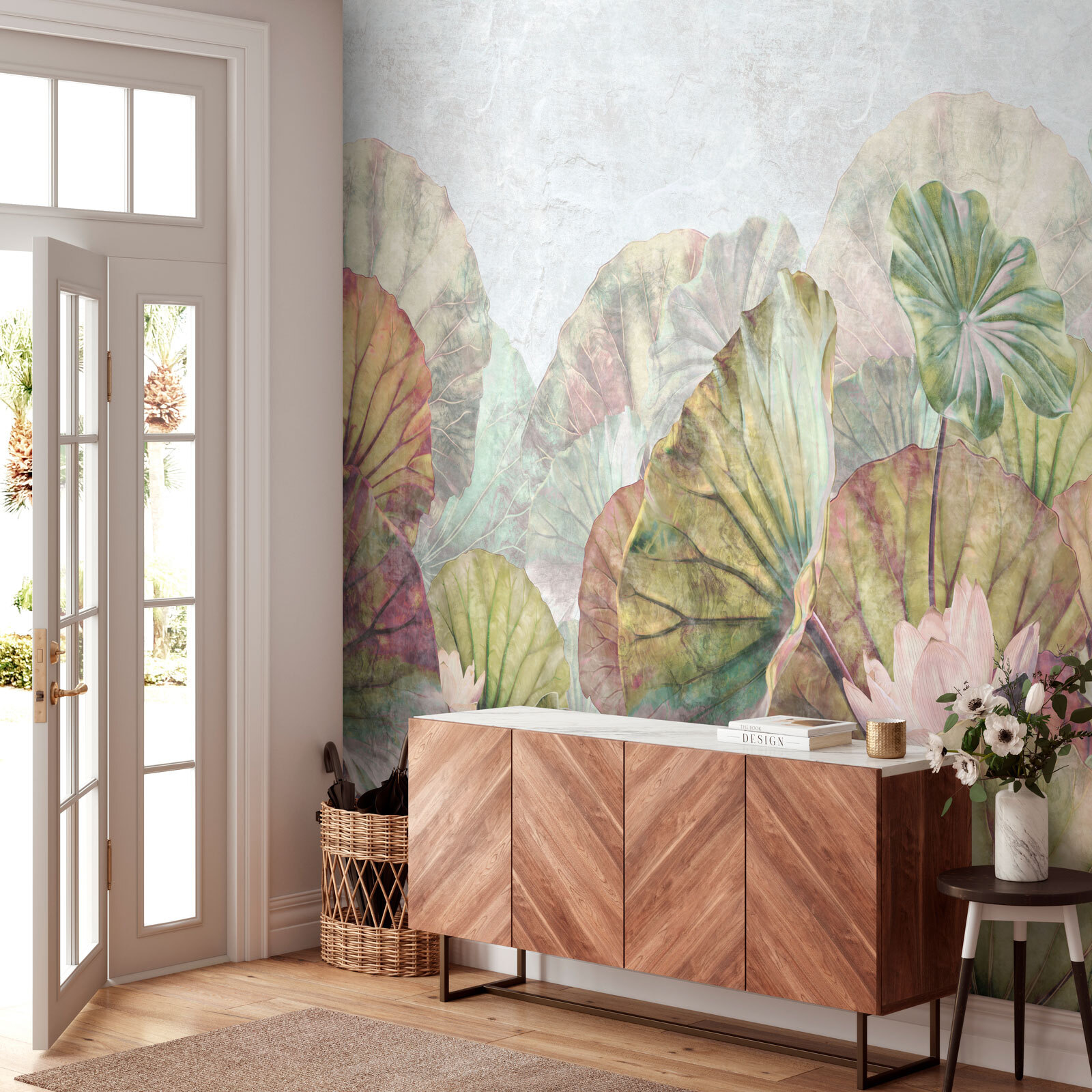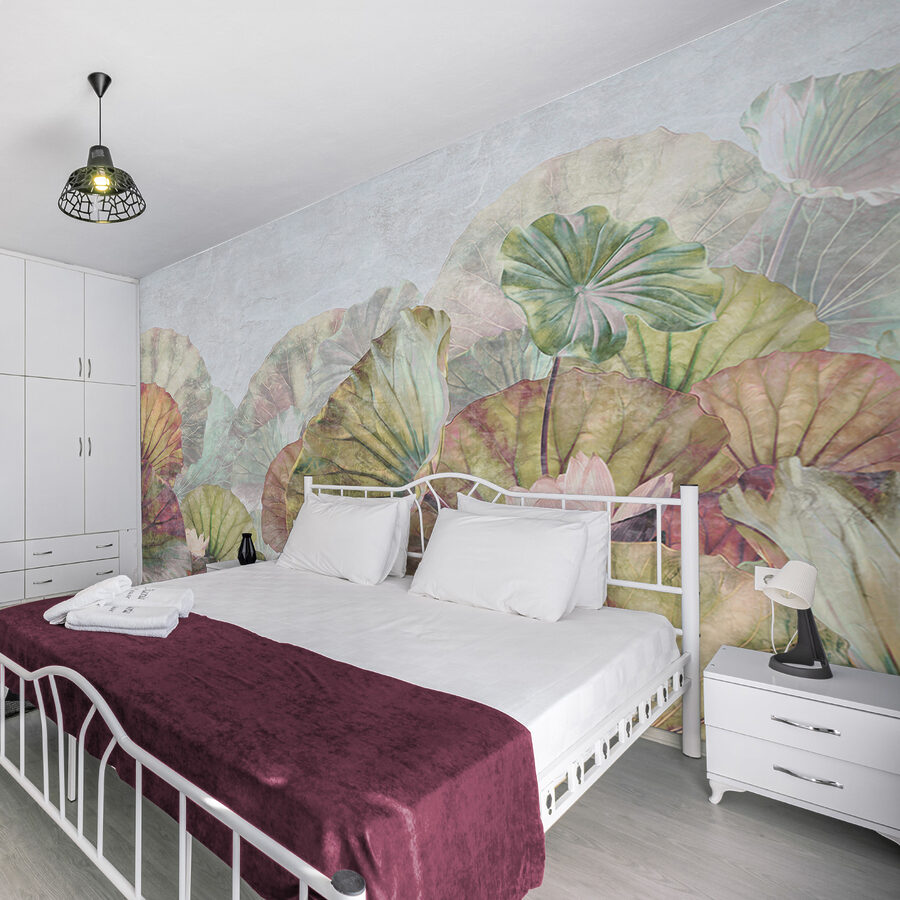 Képzeld el, hogy belépsz egy szobába, és azonnal elborít a lágy pasztellszínekkel festett lótuszlevelek nyugtató, derűs hangulata. Ez a freskó nem csak egy tapéta – olyan, mintha egy békés menedékhelyre lépnél a nyüzsgő város közepén. A színek suttogóan lágyak, így a levelek finom kecsességgel tűnnek fel.