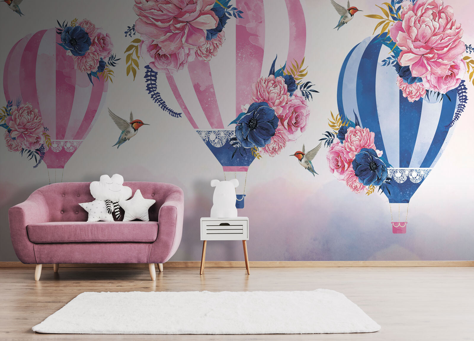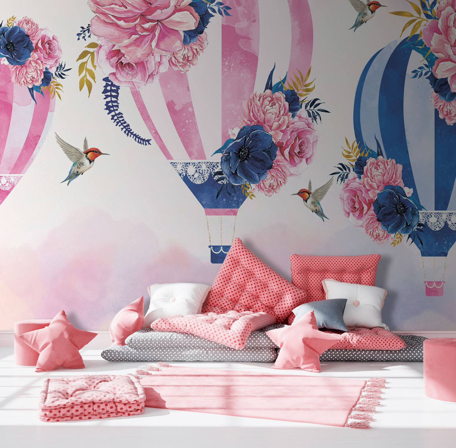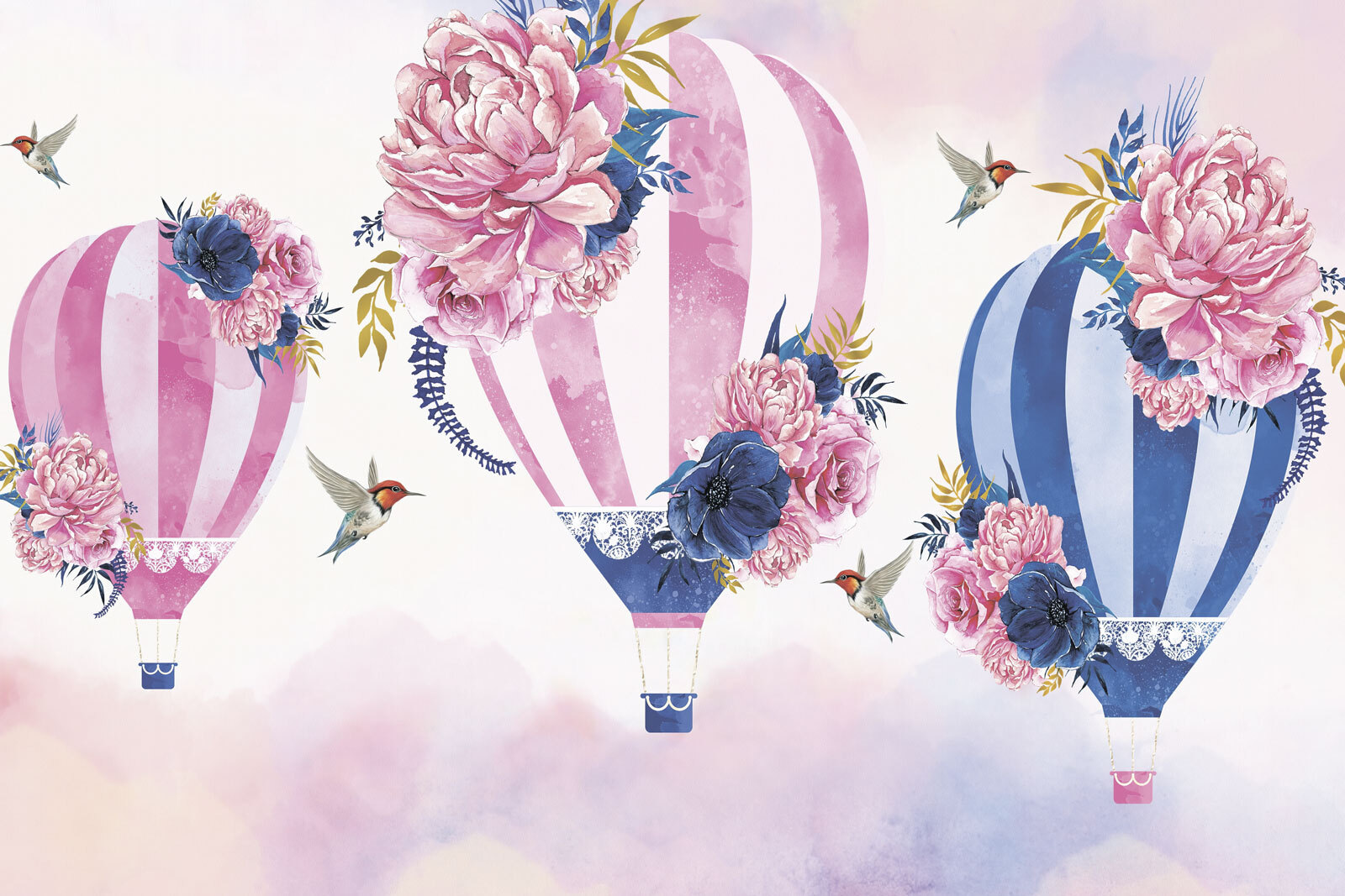 Alakítsd át a teredet ezzel az álomszerű falfestménnyel, amelyen gyönyörű virágokkal díszített hőlégballonok láthatók. Képzeld el, hogy belépsz egy szobába, amely mintha szelíd szellőn lebegne, és ahol minden ballon színt és vidámságot hoz. A lágy árnyalatok és a finom virágok nyugodt hangulatot teremtenek, amely tökéletes egy hangulatos olvasósarokhoz vagy egy vidám gyerekszobához. Ráadásul azok a kis kolibrik? Imádnivalóak! Olyan, mintha a természet és a művészet egy kedves beszélgetést folytatott volna, és Ön élvezheti a mesterművet. Ki ne érezné magát egy kicsit könnyebbnek, ha csak ránéz? Tökéletes azok számára, akik hisznek abban, hogy egy csipetnyi varázslat minden otthon sarkában megtalálható!