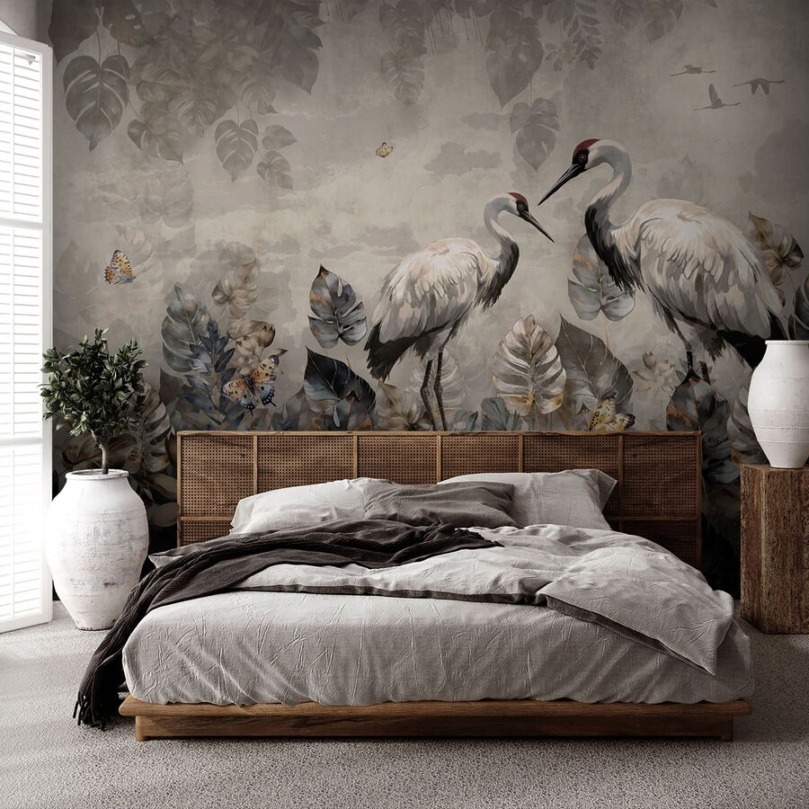 Képzelje el, hogy felébred, kinyújtózik, és csak elmerül a két daru nyugodt látványában, az egyik egy halat tart a kezében, ott a falán. Ez a falfestmény több mint egyszerű dekoráció; olyan, mintha a természet költészetének egy darabkája lenne a házban. Hangulatos kékek és földszürkék között táncol, a pillangók pedig olyan levelek körül repkednek, mintha a késő ősz csókolta volna meg őket.