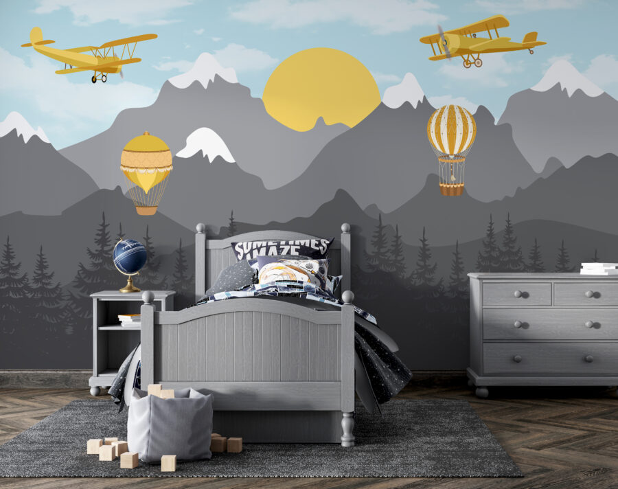 Változtassa át a gyermekszobát egy szeszélyes égi kalanddá ezzel a bájos falfestménnyel, amelyen egy sárga repülőgép emelkedik a fenséges hegyek és játékos hőlégballonok fölé. Képzeld el, milyen izgatottan bámulnak felfelé a kicsik, távoli tájakról és a repülés izgalmáról álmodozva. A lágy kékek és a tompa szürkék nyugtató hátteret teremtenek, míg a vidám sárga szín felkelti a figyelmet – és örömöt okoz. Akassza fel a hálószobában vagy a játszótéren, és nézze, ahogy a képzelet szárnyra kap! Olyan, mintha egy kis darabka égbolt lenne a lakásban – csak talán nem igazi felhőkkel. Tökéletes a kalandvágyó lelkeknek!