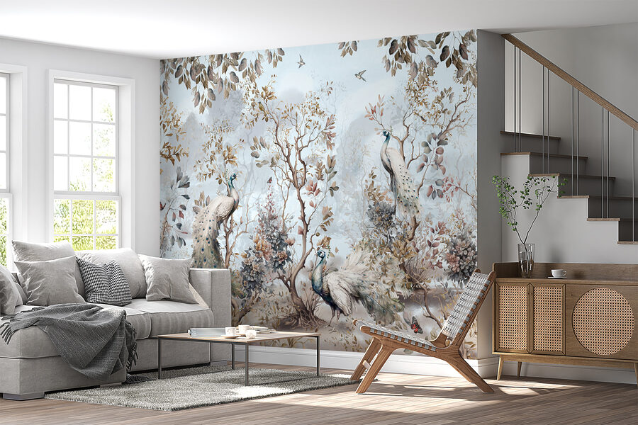 Szeretné a természet szeszélyét a beltérbe vinni? A “Madár repül az égen” falfestmény lehet, hogy pont erre van szüksége. Képzelje el, hogy erre az álomszerű jelenetre ébred, ahol elegáns pávák sétálnak a gyönyörűen festett fák körül. A lágy árnyalatok és a bonyolult részletek olyan érzést keltenek, mintha a természet nyugodt ölelését éreznéd a nappalidban vagy a hálószobádban.