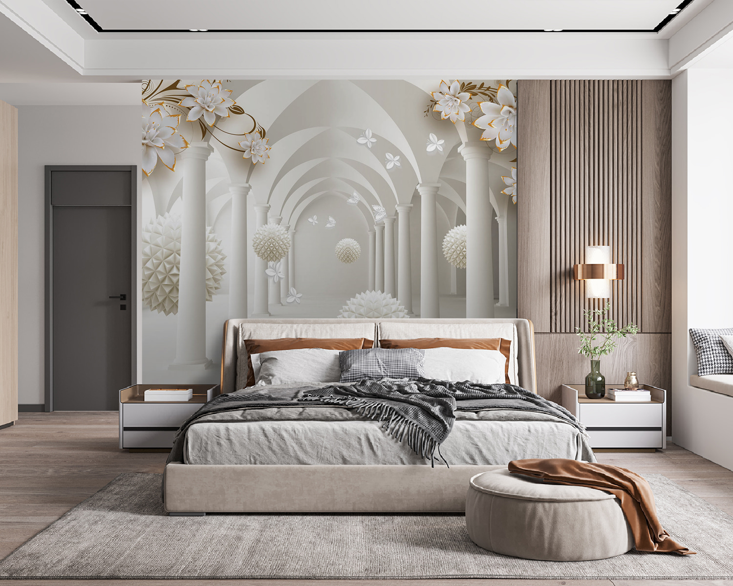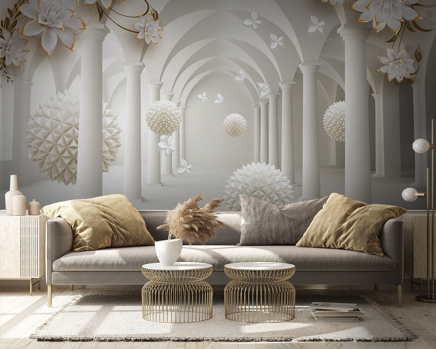 Képzelje el, hogy belép egy olyan szobába, amely azonnal egy elegáns, álomszerű terembe repíti, tele lebegő virággömbökkel – varázslatosan hangzik, igaz? Ez az “Elegáns terem lebegő virágos gömbökkel” című lenyűgöző falfestmény nem csak egy műalkotás, hanem egy élmény. A finom 3D-s virágelemek és az alagútszerű ívek egy csipetnyi kifinomultságot kölcsönöznek a helyiségnek egy játékos csavarral. Tökéletes azoknak, akik szeretik úgy érezni, hogy a nappalijuk egy nyugodt kert vagy egy varázslatos palota kapuja. Ráadásul a gyengéd, semleges tónusok könnyedén illeszkednek bármilyen dekorációs stílushoz, így sokoldalú választás, ha a falakat vizuálisan lenyűgöző fókuszponttá akarja varázsolni. Akár egy kis fantáziát szeretne a mindennapjaiba, akár csak egy egyedi beszélgetésindítót szeretne, ez a falfestmény tökéletesen megfelel a célnak – miért ne adná meg a helyiségének a wow-faktort?