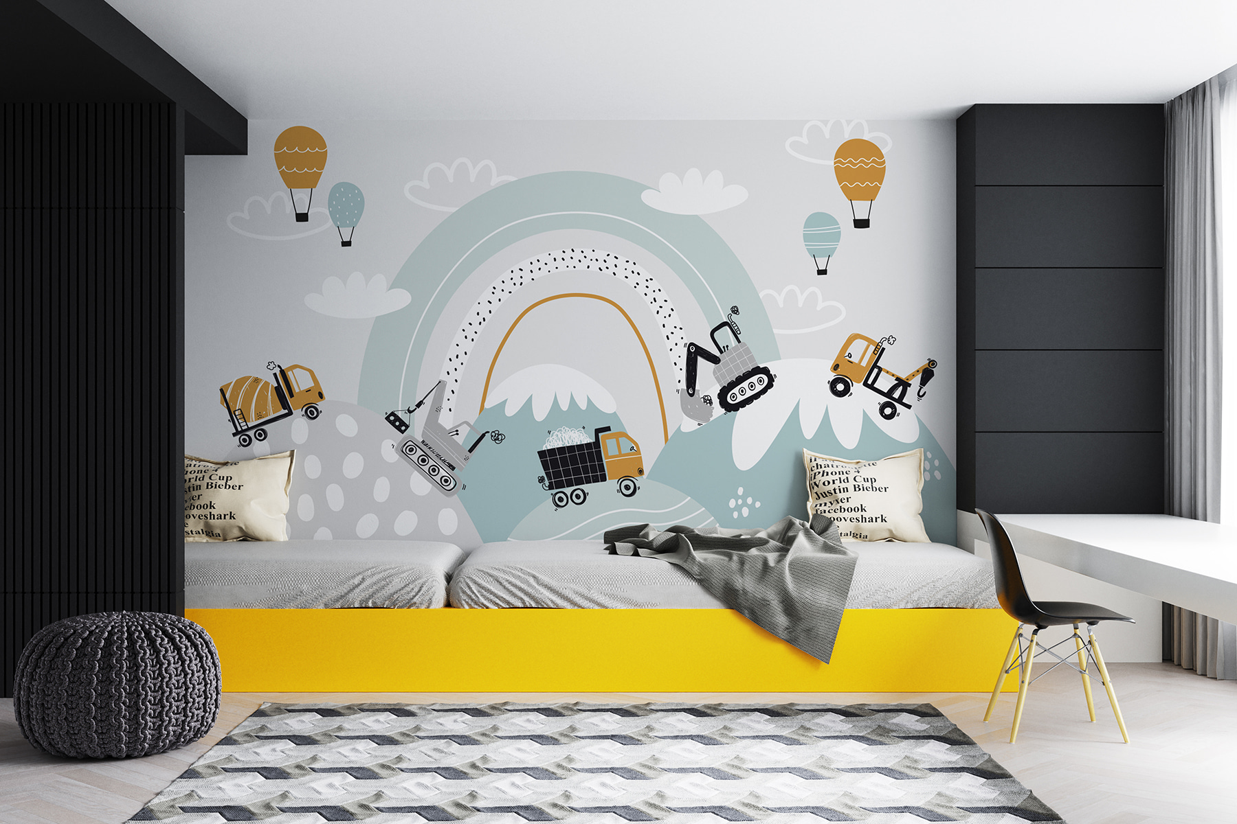 Hát nem elbűvölő ez a falfestmény? Olyan, mint egy apró világ a kisgyermeked számára, tele építési kalandokkal. Képzeld el: vibráló betonkeverők, vidám felhők és aranyos kis kotrógépek, amelyek a dombok között száguldoznak. Játékos, szeszélyes hangulata van, amely bármelyik szobát feldobja. Tökéletes a gyerekek számára, és beindítja a fantáziájukat. És ezek a pasztellszínek – komolyan, lehetne ennél tökéletesebb? Képzeld el a kacagást, amikor arról álmodoznak, hogy saját tájképet építenek. Ez a falfestmény nem csak dekoráció; ez egy boldogságfrissítés az otthonodban!