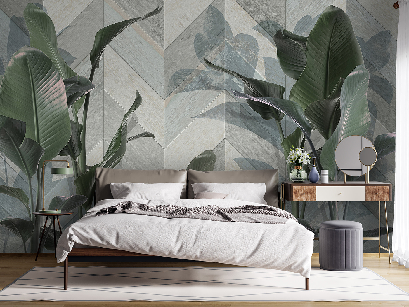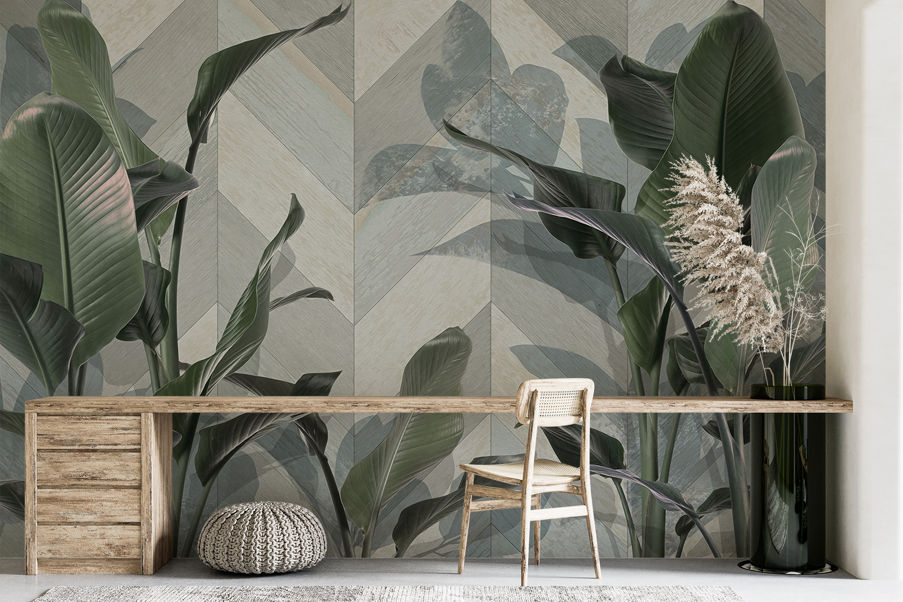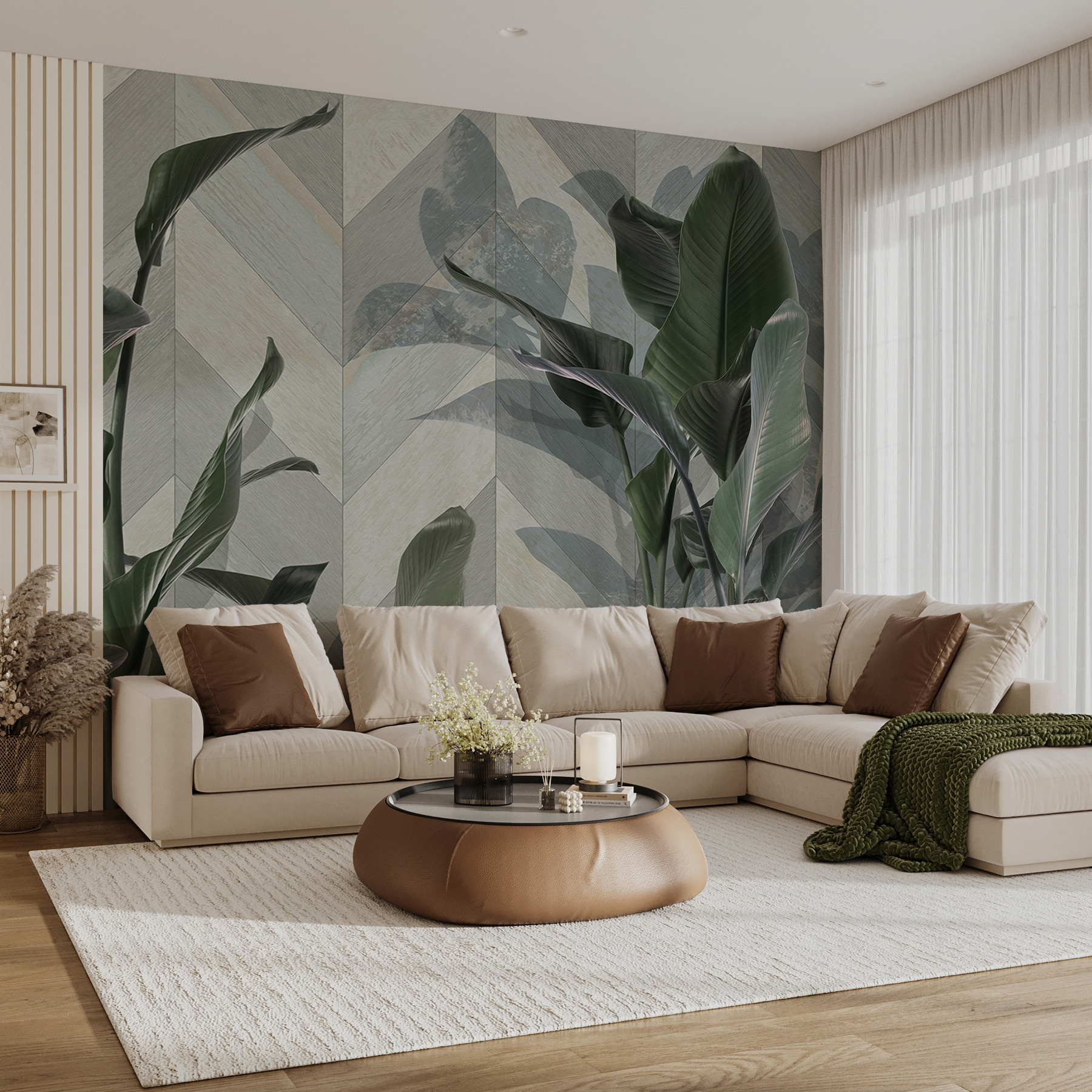 Alakítson át bármilyen helyiséget ezzel a lenyűgöző, buja zöld leveleket ábrázoló falfestménnyel, elegáns mintás háttér előtt. Olyan, mintha egy erdő nyugalmát hozná be a lakótérbe! Képzelje el, hogy minden reggel úgy ébred, mintha egy hangulatos, természettől körülvett faházban lenne. A lombos jóság frissítő hangulatot kölcsönöz, tökéletes azokon a napokon, amikor a bogarak és az időjárási gondok nélkül vágyik egy kicsit a természetre. Ráadásul a finom minták érdekesen tartják a dolgokat – senki sem fogja tudni, hogy csak álmodozol-e egy trópusi kiruccanásról, vagy valóban meg is éled azt! Ez a falfestmény nem csak dekoráció; ez egy élmény, ami csak arra vár, hogy megtörténjen.