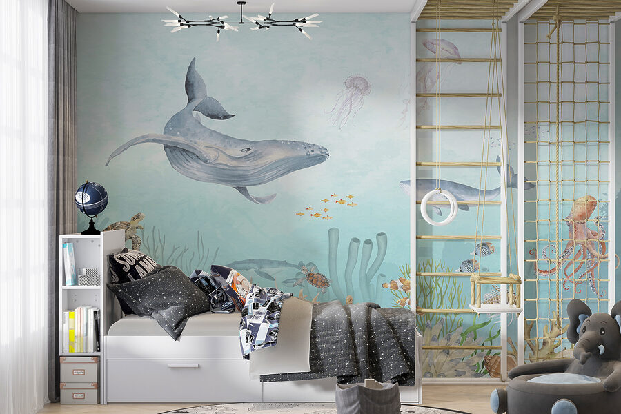 Merülj el a csodák tengerében ezzel a lenyűgöző “Underwater Life” falfestménnyel! Képzelje el, hogy egy egyszerű szobát egy játékos tengeri élőlényekkel és élénk korallzátonyokkal teli óceáni paradicsommá alakíthat. Ez a falfestmény tökéletes a gyerekek és a kisgyermekek képzeletének beindítására, és a mélykék varázsát egyenesen az otthonodba hozza. Van itt egy óriás bálna – és nézd! Egy apró bohóchalcsoport bújócskázik az anemónák között. Akár gyermeke gyerekszobájában, akár szeszélyes fürdőszobájában, azonnal kalandot és nyugalmat áraszt. Hát nem hallja szinte a víz lágy morajlását és a polip csápjainak lágy suhogását? Telepítse ezt a helyiségébe, és nézze, ahogy a szemek tágra nyílnak az örömtől (és talán egy-két kis kuncogást is). Ez több, mint egy falfestmény, ez egy víz alatti szökés, anélkül, hogy vizes lenne – szóval rajta, csobbanjon egyet!