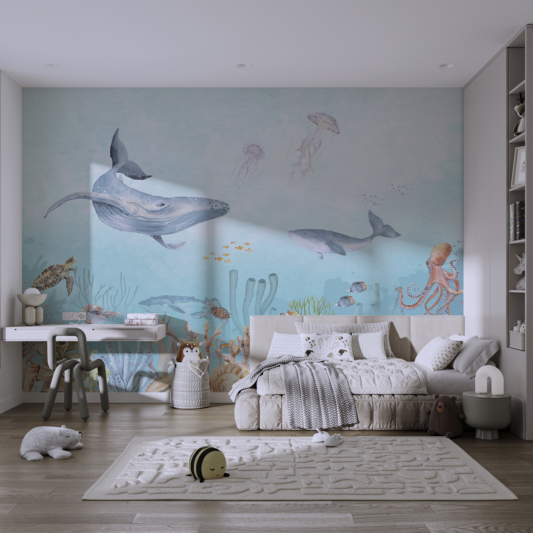 Merülj el a csodák tengerében ezzel a lenyűgöző “Underwater Life” falfestménnyel! Képzelje el, hogy egy egyszerű szobát egy játékos tengeri élőlényekkel és élénk korallzátonyokkal teli óceáni paradicsommá alakíthat. Ez a falfestmény tökéletes a gyerekek és a kisgyermekek képzeletének beindítására, és a mélykék varázsát egyenesen az otthonodba hozza. Van itt egy óriás bálna – és nézd! Egy apró bohóchalcsoport bújócskázik az anemónák között. Akár gyermeke gyerekszobájában, akár szeszélyes fürdőszobájában, azonnal kalandot és nyugalmat áraszt. Hát nem hallja szinte a víz lágy morajlását és a polip csápjainak lágy suhogását? Telepítse ezt a helyiségébe, és nézze, ahogy a szemek tágra nyílnak az örömtől (és talán egy-két kis kuncogást is). Ez több, mint egy falfestmény, ez egy víz alatti szökés, anélkül, hogy vizes lenne – szóval rajta, csobbanjon egyet!