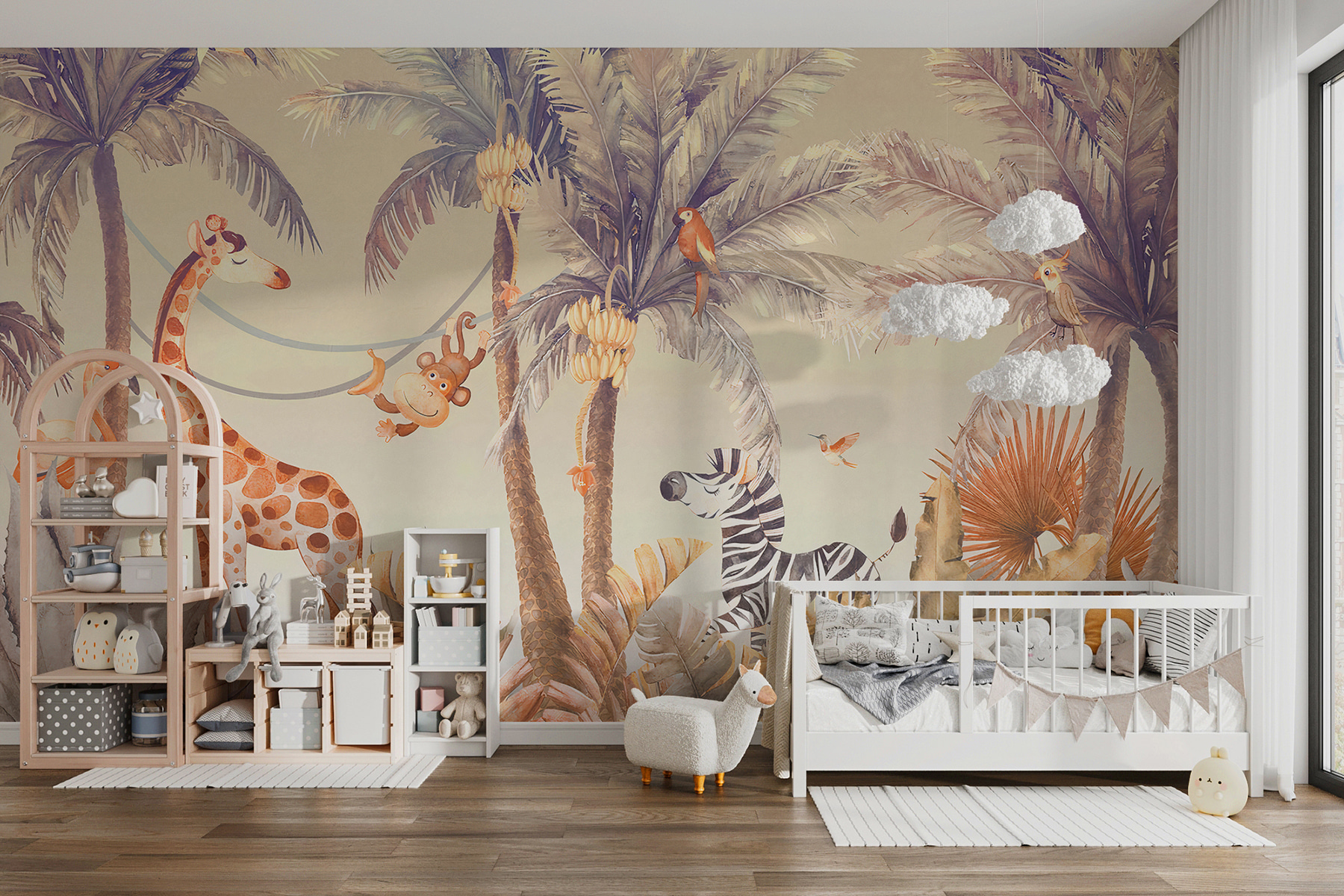 Képzeld el, hogy belépsz egy szobába, és egy dzsungelbuli fogad! Ez a falfestmény, amelyen egy élénk állatcsapat gyönyörködik a napsütésben, a kaland érzését hozza el otthonába. Egy barátságos zsiráf mellett egy vidám majom hintázik egy kényelmes függőágyban, míg a mókához egy zebra és egy flamingó is hozzájárul. Mintha a dzsungel úgy döntött volna, hogy rendez egy kis napsütéses ünnepséget, és téged is meghívtak! Ez a falfestmény tökéletes a gyerekszobákba – gondolj csak a szemükben csillogó szikrára és a fantáziadús történetekre, amelyek kibontakozhatnak. Ez több mint dekoráció; ez egy belépőjegy egy játékos kalandhoz minden nap. Egy csöppnyi szín, egy csipetnyi szeszély és rengeteg öröm vár rád!
