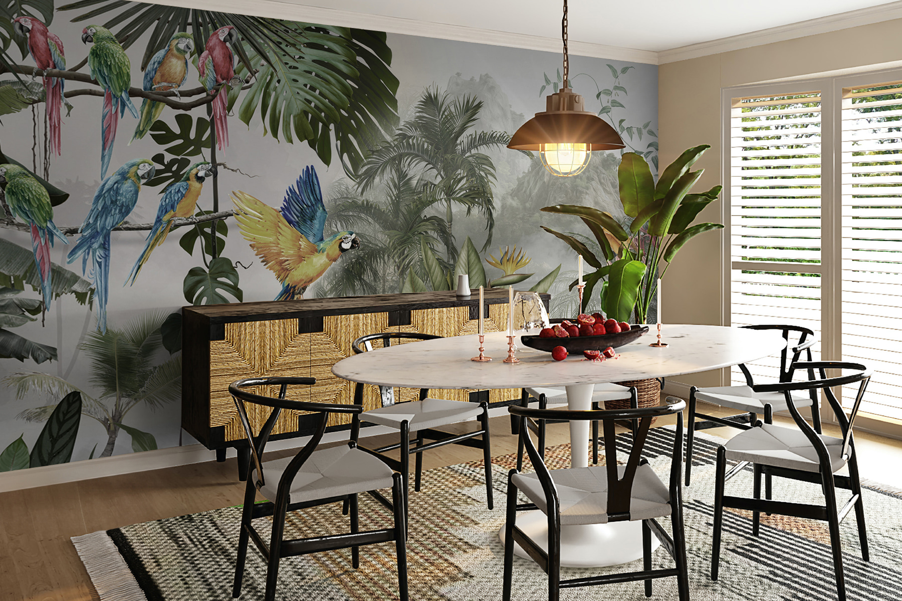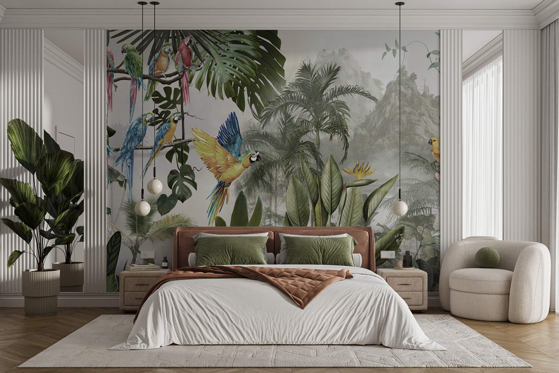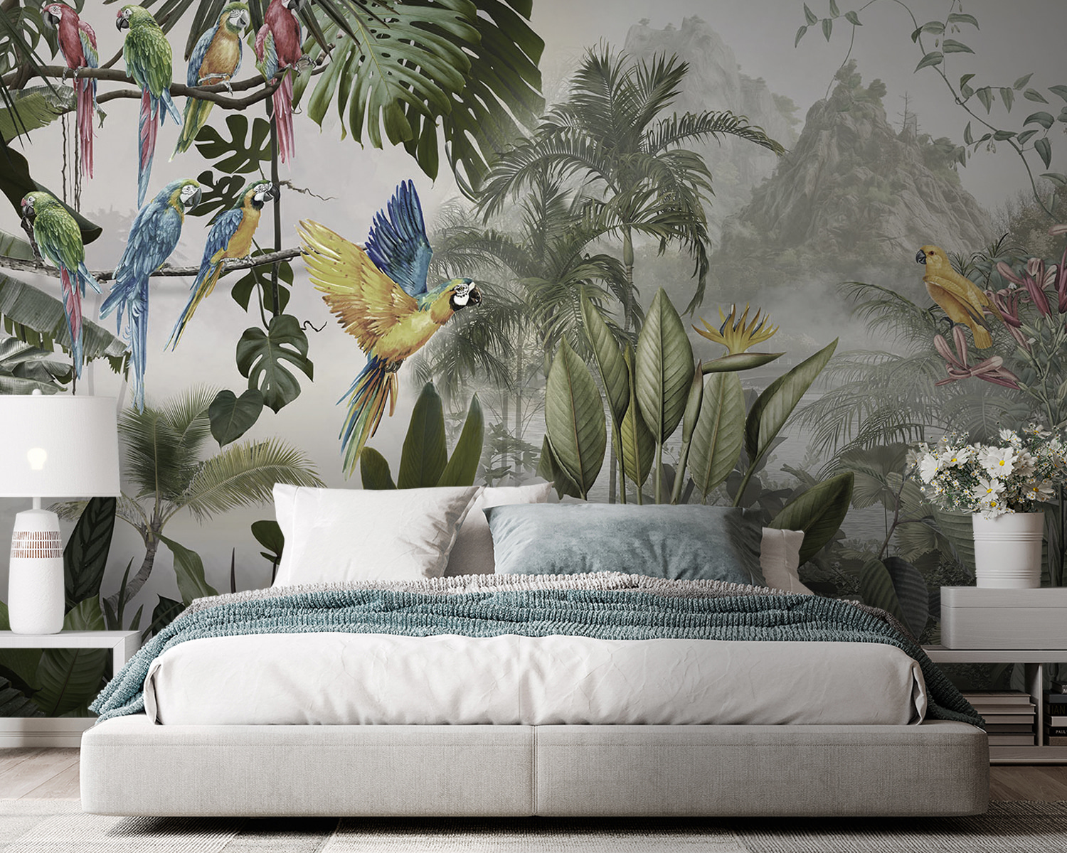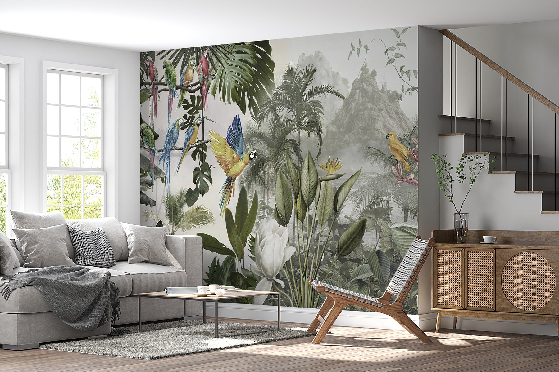 Változtasson bármilyen falat vibráló meneküléssé ezzel a lenyűgöző, színes papagájokat ábrázoló, repülés közbeni falfestménnyel. Képzelje el, hogy egy olyan szobába lép be, ahol ezek a tollas barátok mintha egyenesen a levegőben röpködnének, és minden egyes rikácsolásuk egy trópusi paradicsom varázsát visszhangozza. Olyan, mintha a természet egy darabját hoznád be a lakásba, csak éppen a páratartalom nélkül. A buja levelek és a vibráló virágok életre keltik, és olyan álomszerű hátteret teremtenek, amely örömet és melegséget sugároz.