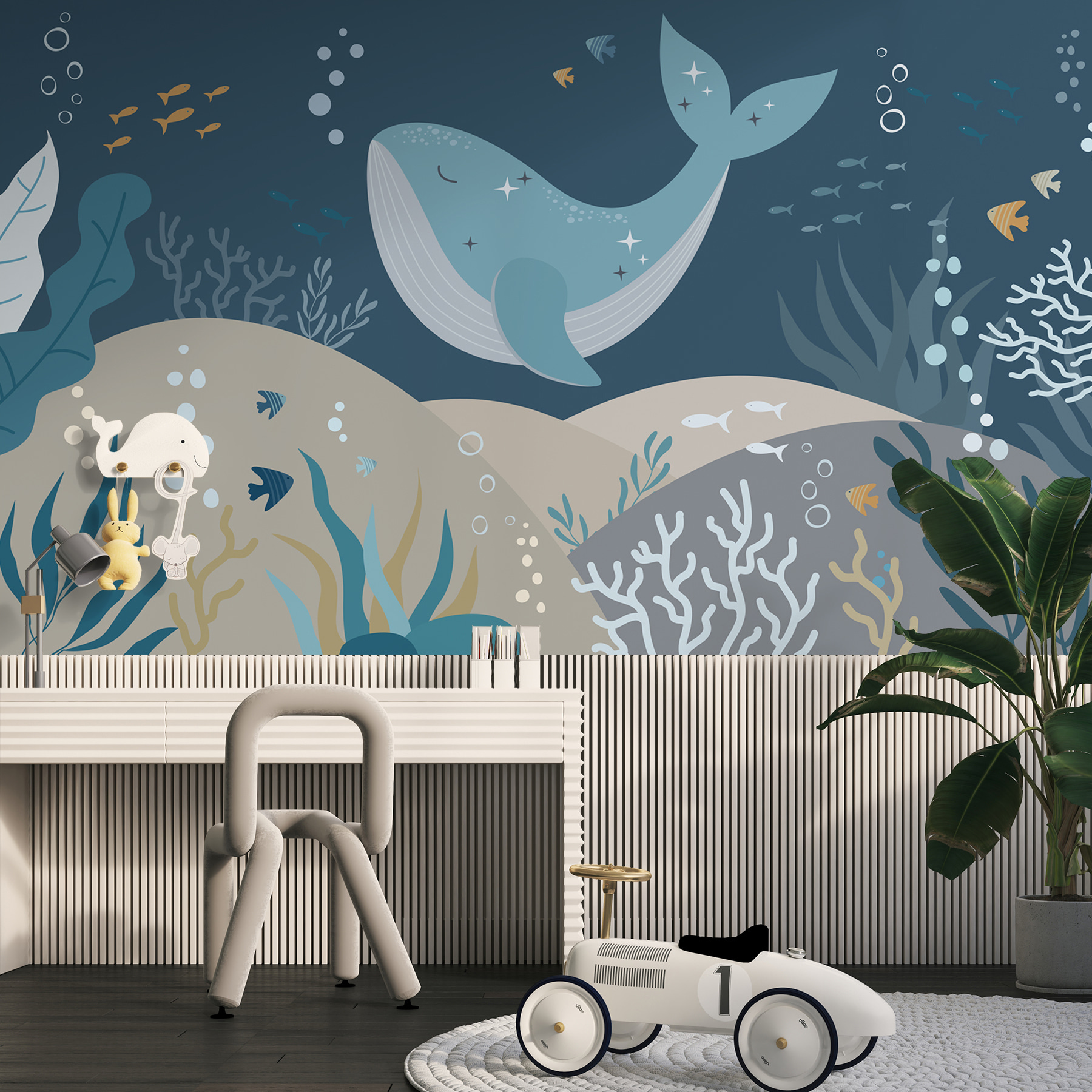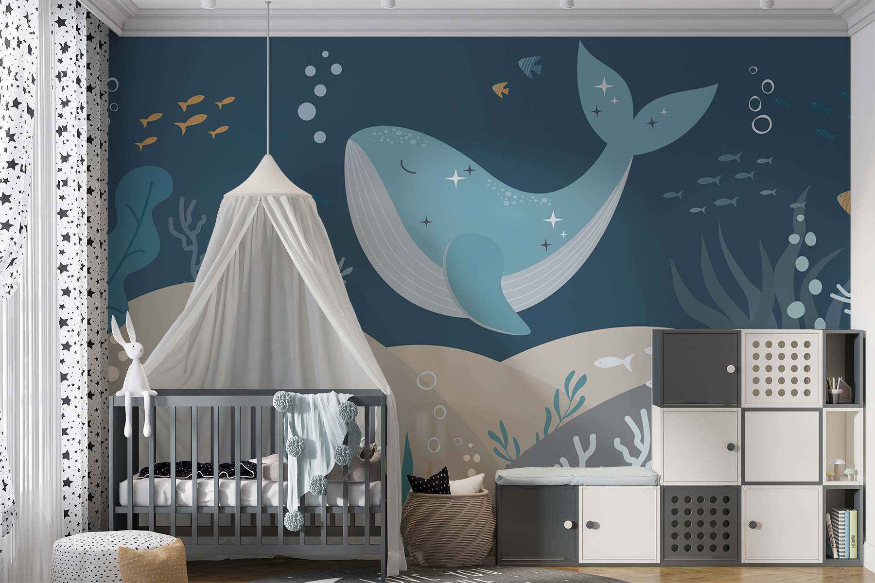 Nézd meg ezt a szeszélyes falfestményt, a “Kék bálna csillagokkal és halakkal”. Komolyan, olyan, mintha egy víz alatti álomországba merülnél! Tökéletes gyerekszobába vagy gyerekszobába, képzelj el egy finoman sodródó kék bálnát, csillogó csillagokkal megszórva, játékos halakkal körülvéve. Ne lepődj meg, ha a kicsik elvesznek a saját óceáni kalandjaikban. A lágy kék tónusok olyanok, mint egy nyugodt ölelés – ah, olyan megnyugtató. Varázslatos tengeri utazássá varázsolja az alvásidőt minden este ezzel a varázslatos falfestménnyel. Olyan, mintha az óceán egy darabját hoznád be az otthonodba!