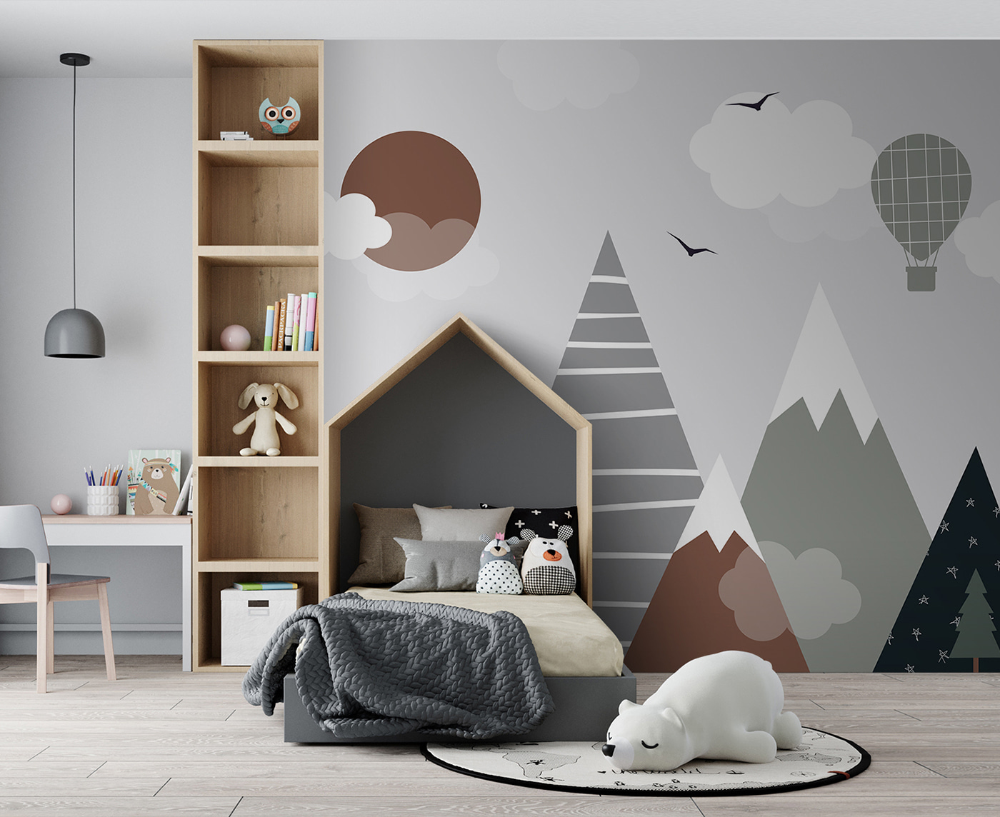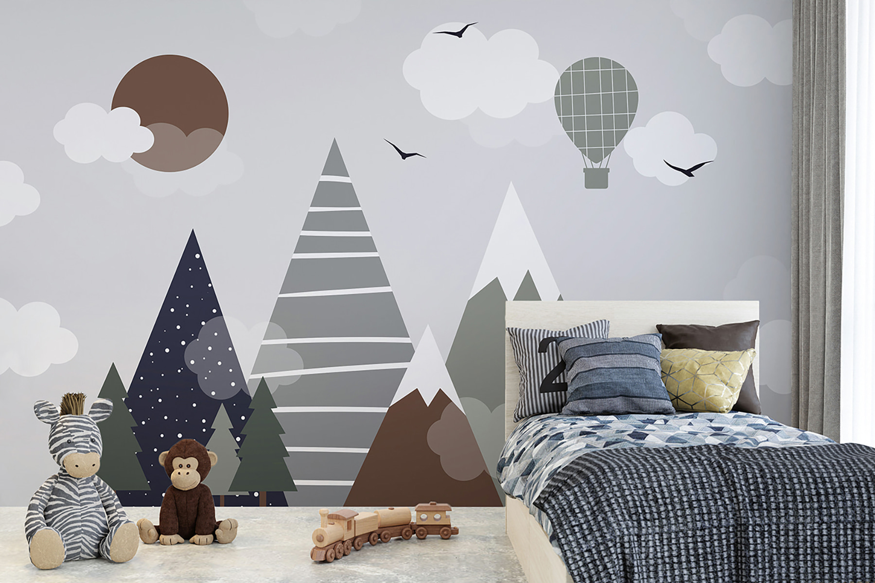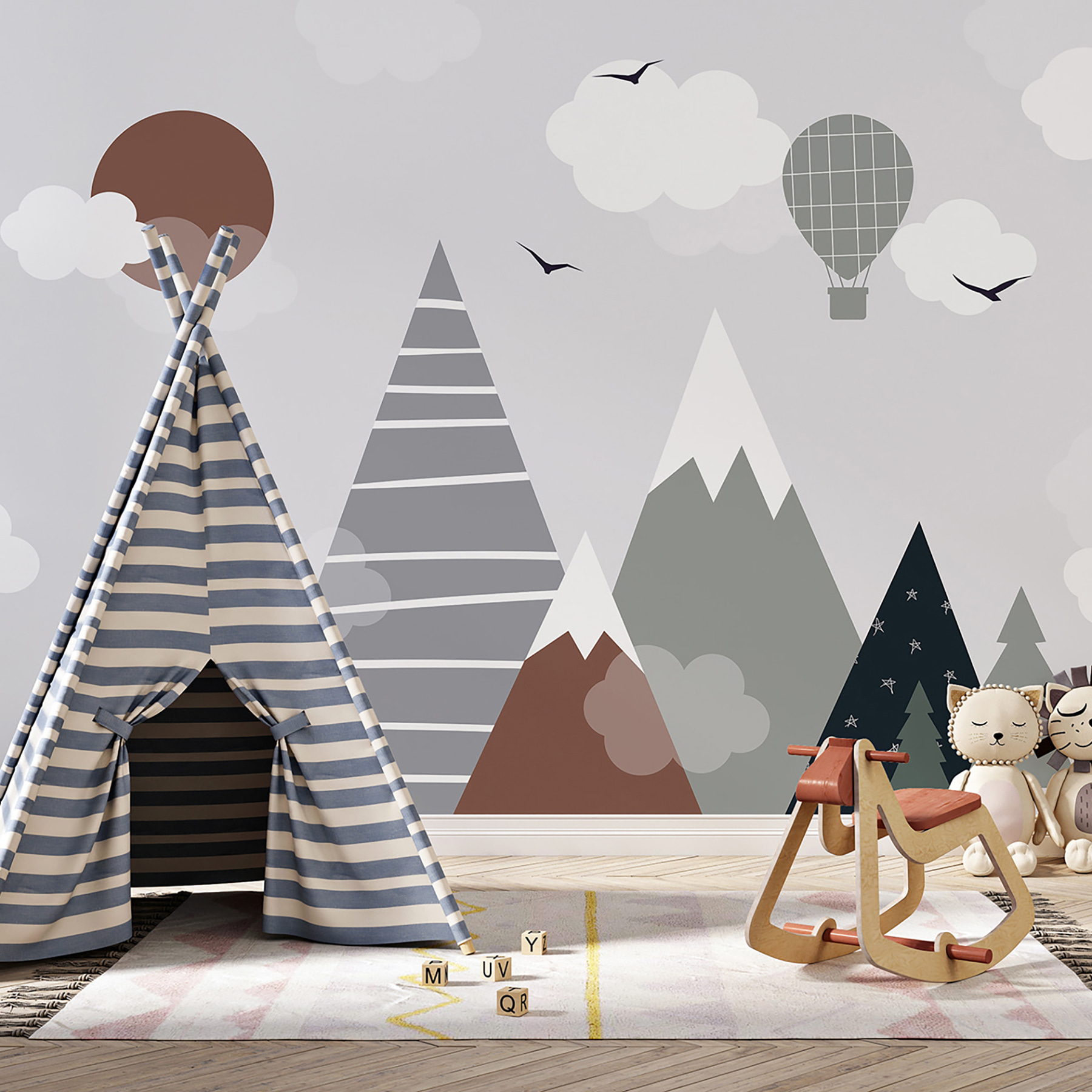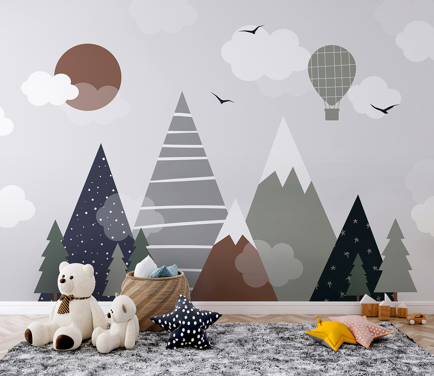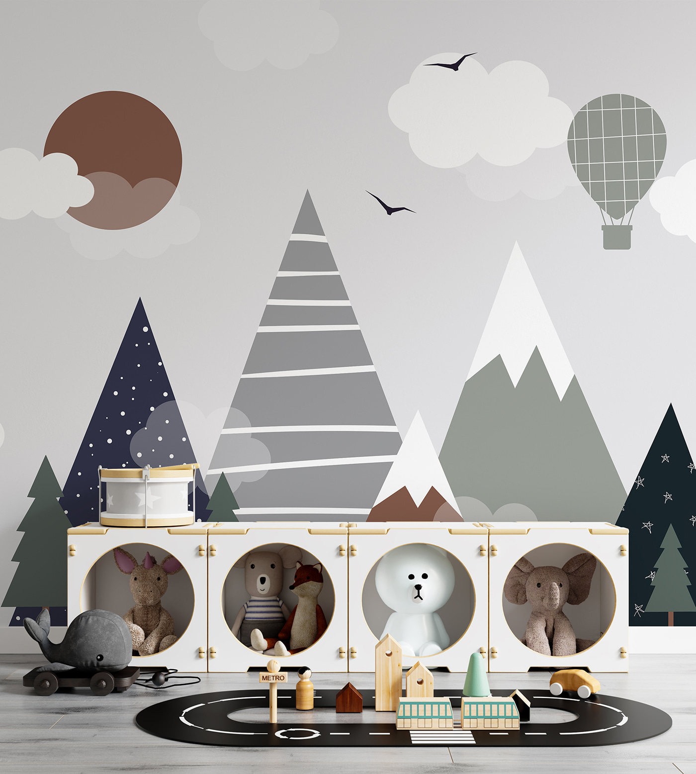 Legyen szó mesemondásról vagy játékról, a gyerekek úgy fogják érezni, mintha egy álomszép erdőbe lépnének. A hegycsúcsok, fenyők és felhőpamacsok művészi keveréke beindítja a kreativitásukat, és távoli tájakra repíti őket. Kiválóan alkalmas csecsemőknek, kisgyermekeknek és tovább. Ráadásul ki ne szeretné, ha egy hőlégballon lebegne a falán? Ideális gyerekszobákba vagy bármely olyan helyiségbe, ahol szükség van a csodák extra csipetnyi varázslatára.