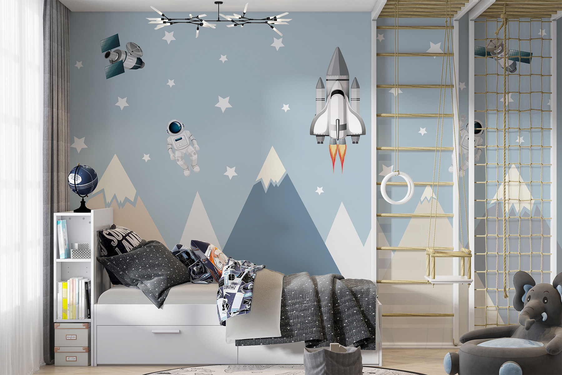 Ez a falfestmény tökéletes gyerekszobákba vagy játszószobákba, és játékos dizájnja egy kis csodát és szeszélyt kölcsönöz. Képzelje el, hogy a gyermeke minden nap fantasztikus utazásokra indul, bátor űrhajósokkal találkozik és távoli galaxisokat fedez fel. Ez nem csak egy falfestmény; ez egy kapu a végtelen képzeletbeli játékhoz. És azok a lágy hegycsúcsok? Szelíd, földhözragadt hangulatot kölcsönöznek az egész jelenetnek. Őszintén szólva, ez tiszta varázslat.