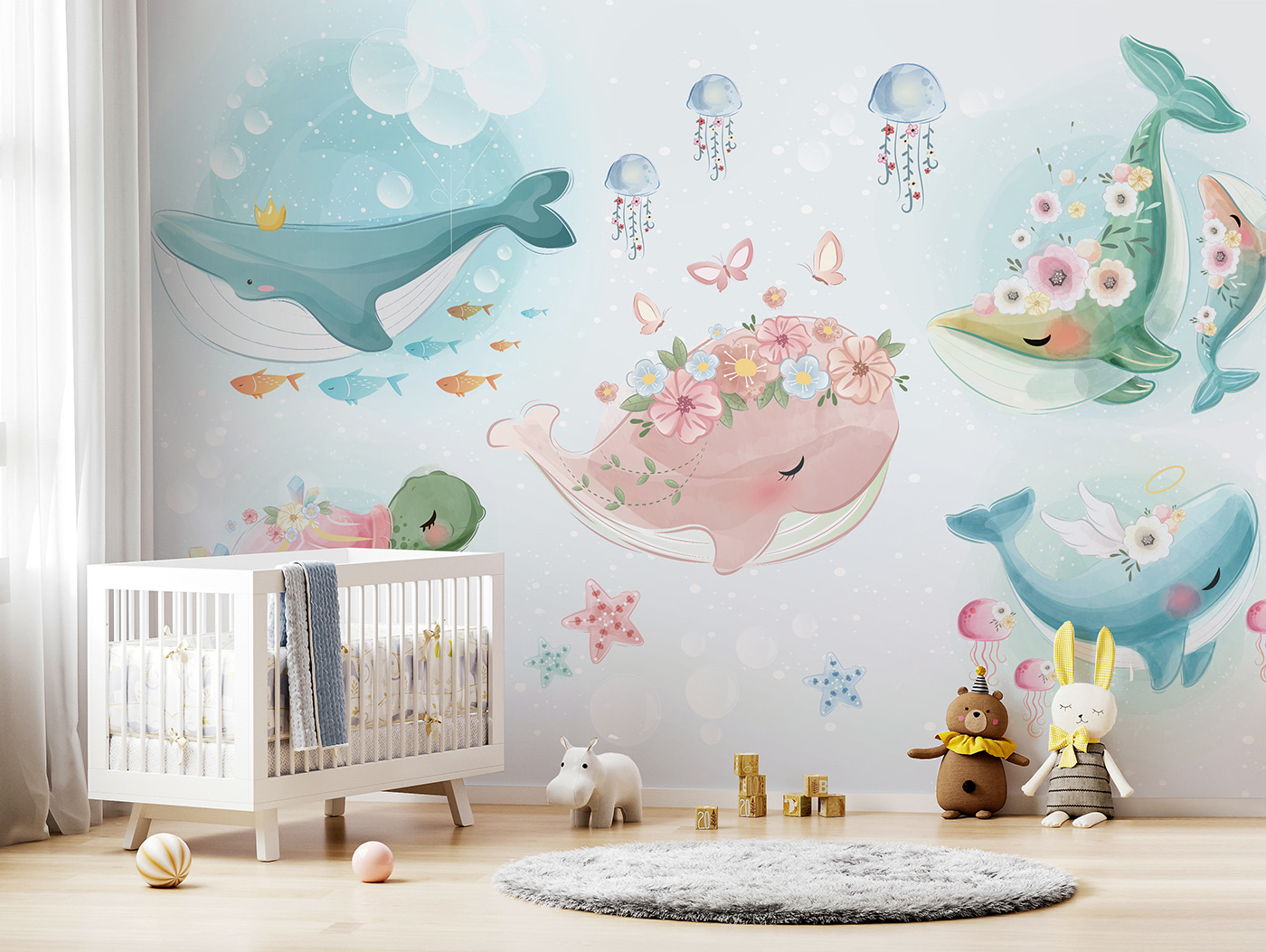 A gyermekterekbe tervezett, lányod imádni fogja, a csecsemőket pedig elvarázsolják a szelíd színek és a játékos karakterek. Olyan, mintha egy víz alatti mese lenne közvetlenül a falon. A lágy, álomszép színek és a bájos részletek olyan megnyugtatóvá teszik – mintha maga a tenger ölelne melegen! Ideális gyerekszobákba vagy játszószobákba, és lehet, hogy számtalan esti mese és fantáziadús játszadozás hátterévé válik. Ki ne szeretné, ha egy bálna vigyázna rá alvás közben? Ennek a falfestménynek varázslatos a varázsa.