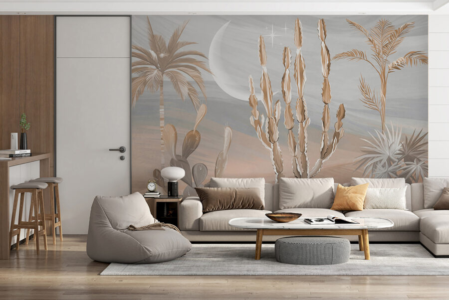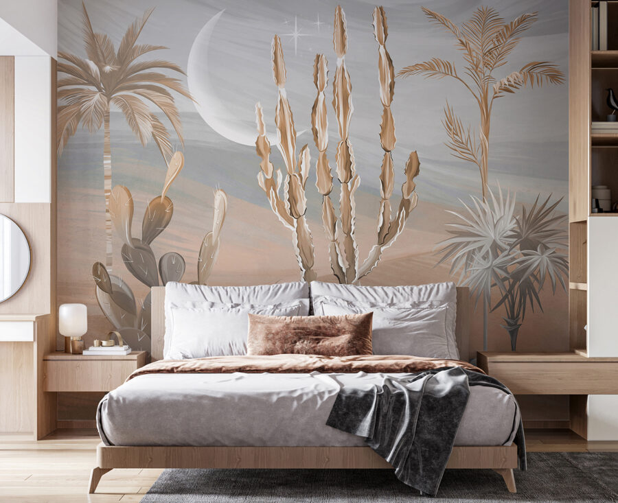 És őszintén, kinek nincs szüksége egy kis sivatagi zenre az életében? Akár kaktuszfanatikus vagy, akár csak egy kis trópusi hangulatra vágysz, ez a falfestmény tökéletes. Szóval rajta, alakítsd át a helyiségedet egy kis szellős sivatagi hangulattal! 🌵🕌