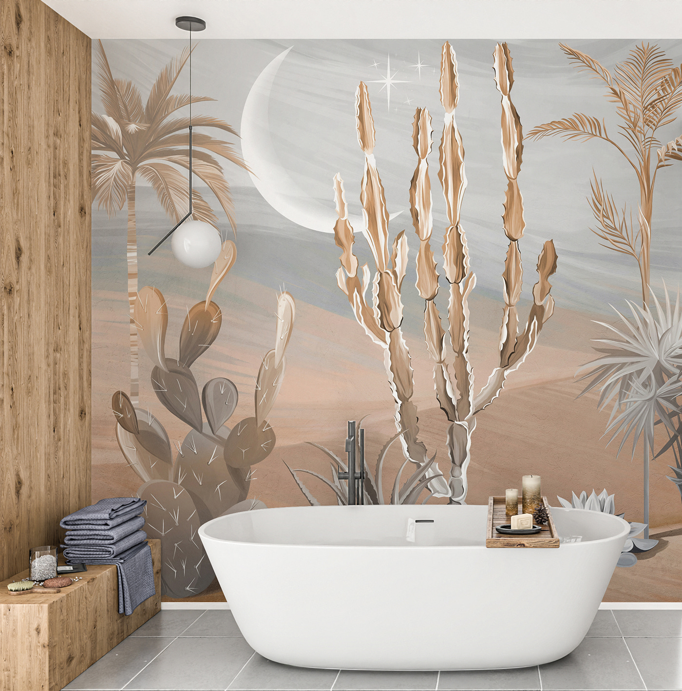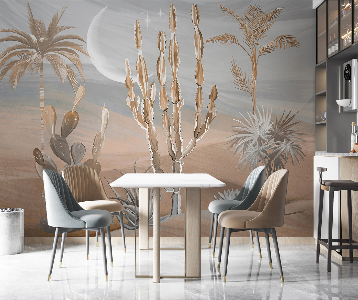 És őszintén, kinek nincs szüksége egy kis sivatagi zenre az életében? Akár kaktuszfanatikus vagy, akár csak egy kis trópusi hangulatra vágysz, ez a falfestmény tökéletes. Szóval rajta, alakítsd át a helyiségedet egy kis szellős sivatagi hangulattal! 🌵🕌