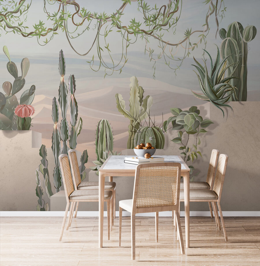 Képzelje el, hogy szobájába lépve úgy érzi, mintha egy varázslatos sivatagi oázisba csöppent volna. Ez a “Sivatagi növények díszítik a napfényes lépcsőfokokat” falfestmény pontosan ezt teszi. Bájos kaktuszaival és buja zöldjével a melegség és a nyugalom megnyugtató keverékét teremti meg. Olyan, mintha a nap minden reggel megcsókolná a falaidat! Ez a 3D-s mestermű tökéletesen alkalmas arra, hogy kisebb tereket nagyobbnak érezzön, mélységet és dimenziót kölcsönözve. A barátok el lesznek ájulva attól, hogy milyen élethűnek és derűsnek tűnik. Ráadásul nincs szükség öntözésre – az Ön kertje!