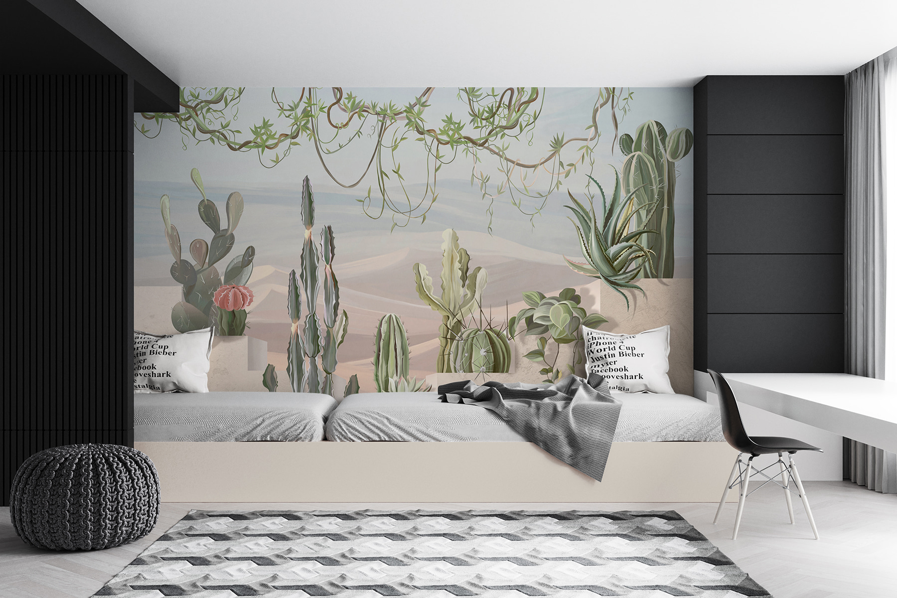 Képzelje el, hogy szobájába lépve úgy érzi, mintha egy varázslatos sivatagi oázisba csöppent volna. Ez a “Sivatagi növények díszítik a napfényes lépcsőfokokat” falfestmény pontosan ezt teszi. Bájos kaktuszaival és buja zöldjével a melegség és a nyugalom megnyugtató keverékét teremti meg. Olyan, mintha a nap minden reggel megcsókolná a falaidat! Ez a 3D-s mestermű tökéletesen alkalmas arra, hogy kisebb tereket nagyobbnak érezzön, mélységet és dimenziót kölcsönözve. A barátok el lesznek ájulva attól, hogy milyen élethűnek és derűsnek tűnik. Ráadásul nincs szükség öntözésre – az Ön kertje!