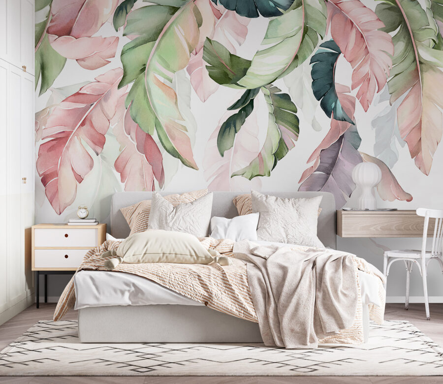 Alakítson át bármilyen szobát leveles pihenőhellyé ezzel a lenyűgöző falfestménnyel, amelyen színes levelek alkotnak kecses lombkoronát. Képzelje el, hogy belép a helyiségébe, és úgy érzi, mintha egy nyugodt erdőbe került volna. A zöld és rózsaszín szelíd árnyalatai, valamint a lágy minták nem csak díszítik a falat – játékos, mégis nyugtató hangulatot árasztanak, amely tökéletes a meghitt éjszakákhoz vagy a vidám reggelekhez. Akár a nappali központi eleme, akár az otthoni beszélgetések hátteréül szolgál, ez a falfestmény a természet eleganciáját adja hozzá, anélkül, hogy kertre lenne szükség. A természet szerelmesei biztosan értékelni fogják a hangulatot, arról nem is beszélve, hogy fantasztikus beszélgetésindítóként szolgál. Nem szükséges zöld hüvelykujj!