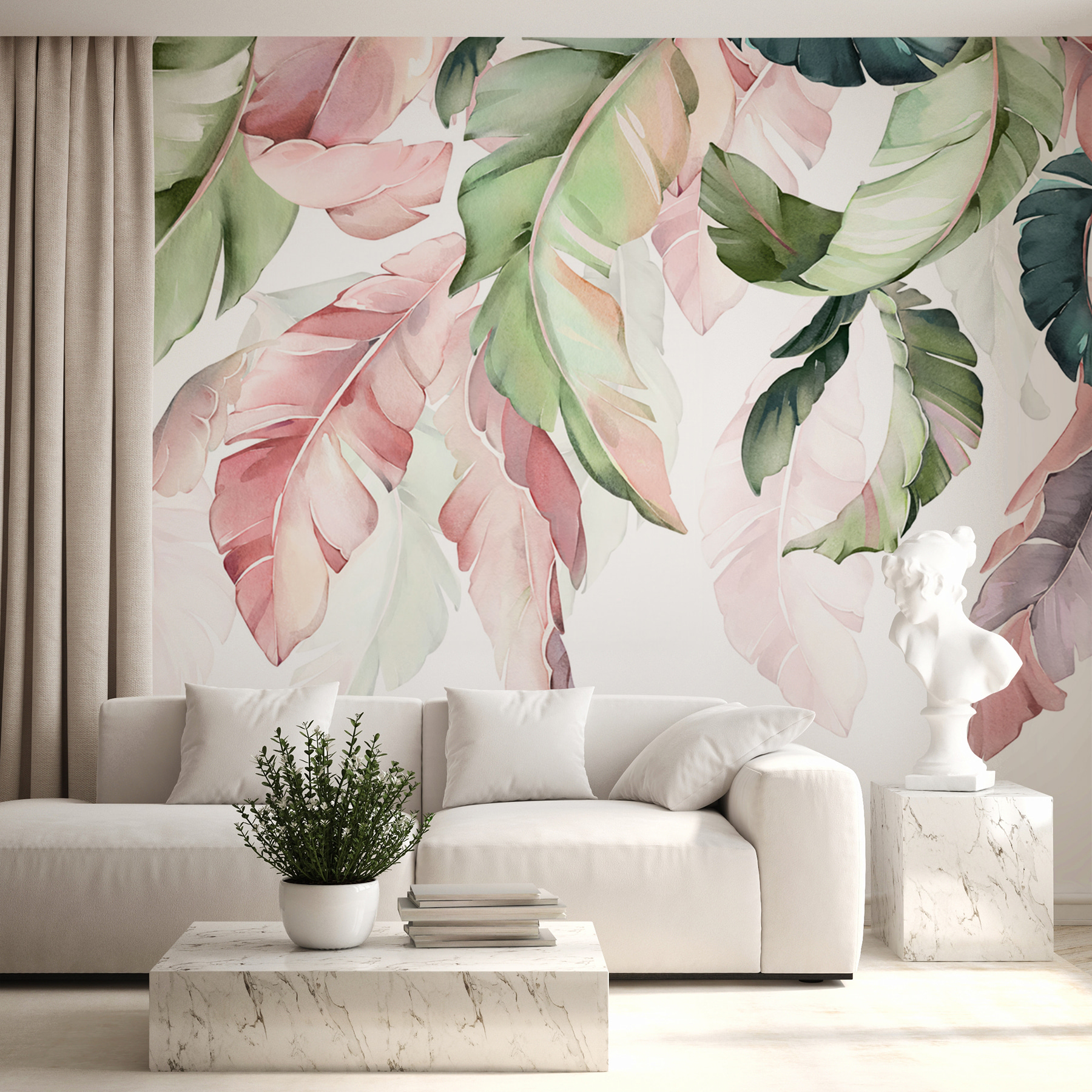 Alakítson át bármilyen szobát leveles pihenőhellyé ezzel a lenyűgöző falfestménnyel, amelyen színes levelek alkotnak kecses lombkoronát. Képzelje el, hogy belép a helyiségébe, és úgy érzi, mintha egy nyugodt erdőbe került volna. A zöld és rózsaszín szelíd árnyalatai, valamint a lágy minták nem csak díszítik a falat – játékos, mégis nyugtató hangulatot árasztanak, amely tökéletes a meghitt éjszakákhoz vagy a vidám reggelekhez. Akár a nappali központi eleme, akár az otthoni beszélgetések hátteréül szolgál, ez a falfestmény a természet eleganciáját adja hozzá, anélkül, hogy kertre lenne szükség. A természet szerelmesei biztosan értékelni fogják a hangulatot, arról nem is beszélve, hogy fantasztikus beszélgetésindítóként szolgál. Nem szükséges zöld hüvelykujj!