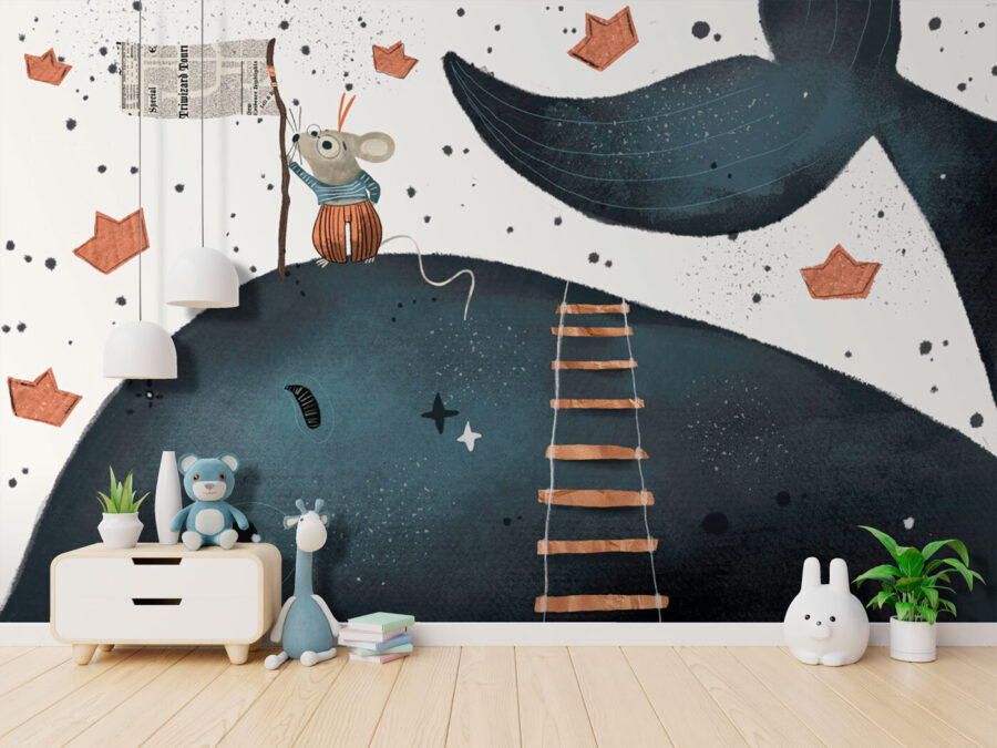 Bármely gyermek terét varázsolja szeszélyes kalanddá ezzel a bájos falfestménnyel. Képzeld el: egy vidám egér bátran felmászik egy létrán, zászlót lenget egy barátságos bálnán, körülötte bájos papírhajókkal. Ez egy vizuális történet, amely csak arra vár, hogy beindítsa a kis képzeletet.