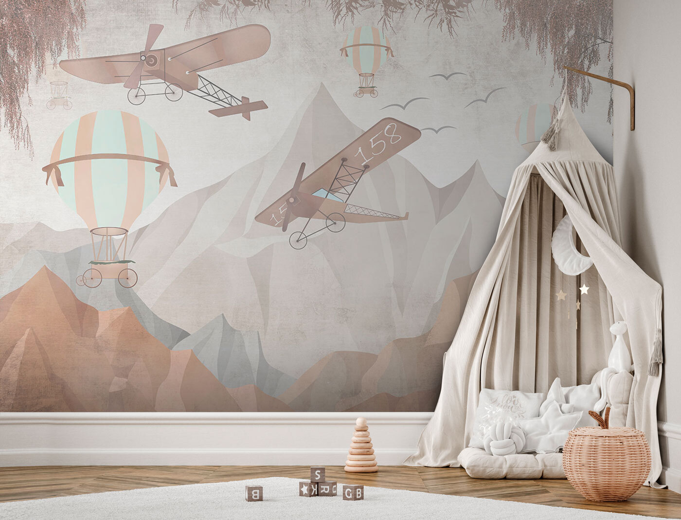 Képzelje el, ahogy a kisgyermeke felnéz, és talán azt képzeli, hogy az egyik ilyen bájos léggömbön utazik. Ez nem csak egy falfestmény, hanem egy ugródeszka az álomvilági kalandokhoz és a mesemondáshoz. Akár arról álmodik gyermeke, hogy egy régi repülőgépet vezet, akár arról, hogy a felhők felett lebeg, ez a falfestmény könnyen kreativitást és örömet ébreszt. Inspirálódsz? Igen, ennyire erőteljes. Ráadásul ki ne szeretne egy olyan hátteret, amely alapvetően azonnali menekülést jelent egy nyugodt hegytetőre? Teljesen elbűvölő.
