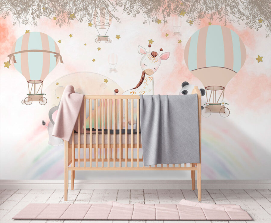 Dobd fel bármelyik gyerekszobát ezzel a varázslatos hőlégballon falfestménnyel! Képzelj el egy álomszerű égboltot, tele szeszélyes léggömbökkel, amelyek imádnivaló állatok – egy bájos zsiráf, egy játékos panda és egy édes kis elefánt – felett lebegnek. Ez a jelenet kalandra invitál és beindítja a képzeletet. Képzeld el, ahogy a kicsik bámulják, álomországba merülnek, és arról álmodoznak, hogy magasan a felhők fölött szárnyalnak. A lágy színek meghitt hangulatot árasztanak, tökéletes az ölelgetős esti mesékhez. Ez a falfestmény nem csak dekoráció; ez egy kapu egy fantáziavilágba. Ki ne szeretne csatlakozni a léggömbös utazásokhoz? Bármilyen teret játékos menedékké varázsol!