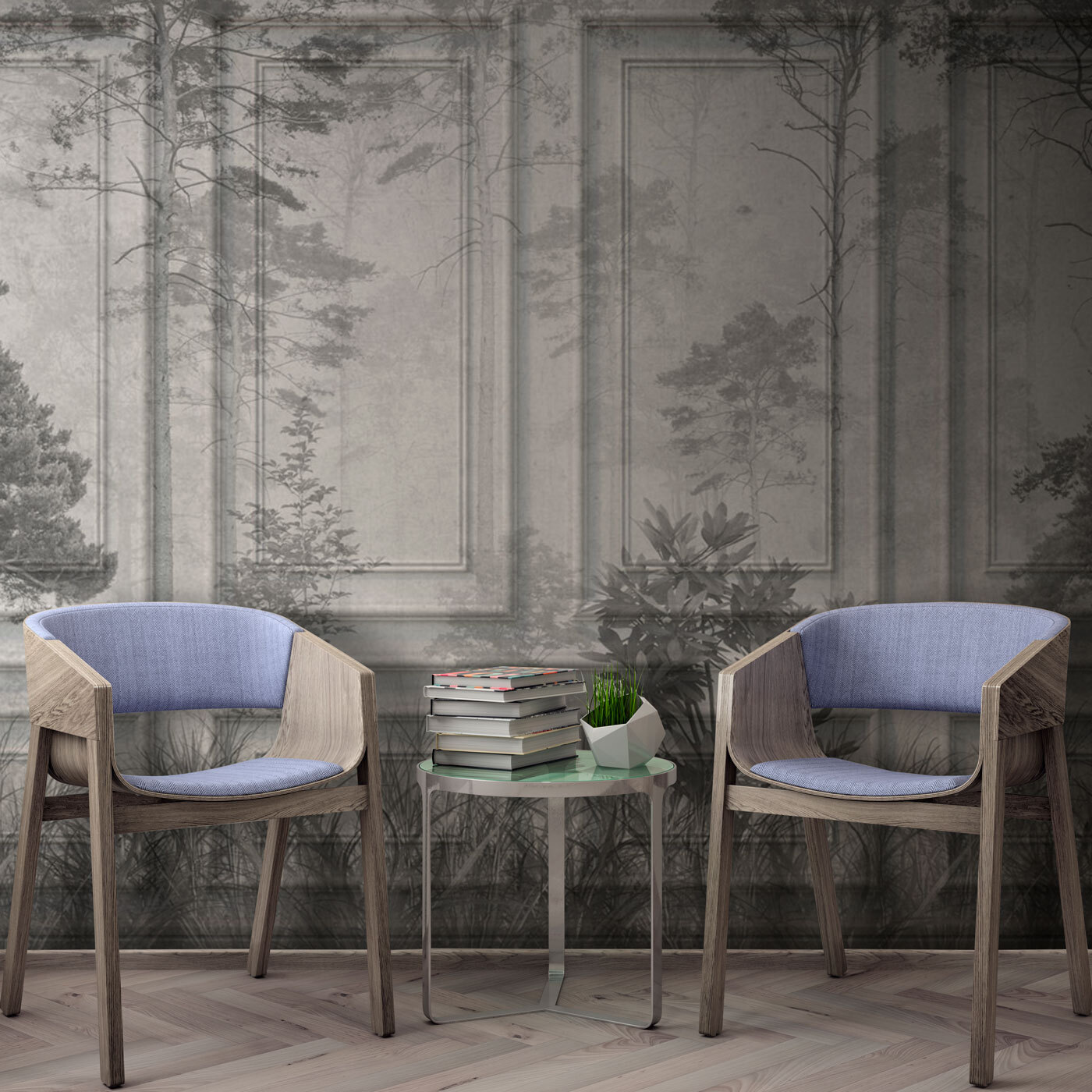 Képzelje el, hogy belép egy olyan szobába, ahol a természet és a klasszikus építészet együtt él. Ez a falfestmény pontosan ezt teszi – mintha egy nyugodt erdei jelenetet hozna egy elegáns könyvtárba. A tompa tónusok olyan simán összeolvadnak, mintha egy esős napon egy időtlen regénybe csöppennél. Ez a nyugtató hatás tökéletes egy olvasósarokba vagy egy olyan nappaliba, ahol csak fellélegezni szeretnél. A boiserie hatású textúra? Ó, ez adja hozzá ezt a kifinomult hangulatot, ami elegáns, de mégis hívogatóvá teszi a teret. A vendégek le lesznek nyűgözve, de ami még fontosabb, Ön úgy fogja érezni, mintha egy szelet nyugalom lenne otthonában.