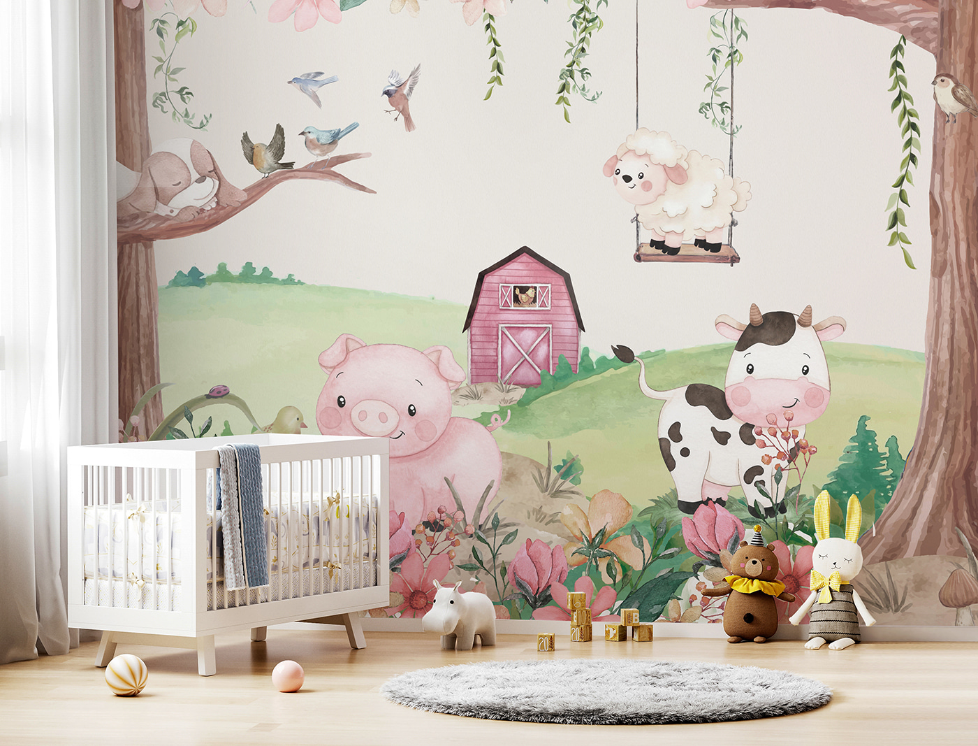 A gyengéd színek és a játékos illusztrációk szuper hívogatóvá teszik. El tudsz képzelni egy hangulatos olvasósarkot vagy játszóteret ezzel a falon? Mintha tökéletes hátteret biztosítana mindenféle kalandhoz – talán még egy játékos bábelőadáshoz is, ahol az állatok a közönséged! És ezek az apró részletek, mint a mosolygó malac és a boldog tehén, garantáltan mosolyt csalnak az arcokra. Ráadásul van benne valami megnyugtató – az egyszerűbb idők és a játékos napok szelíd emléke.