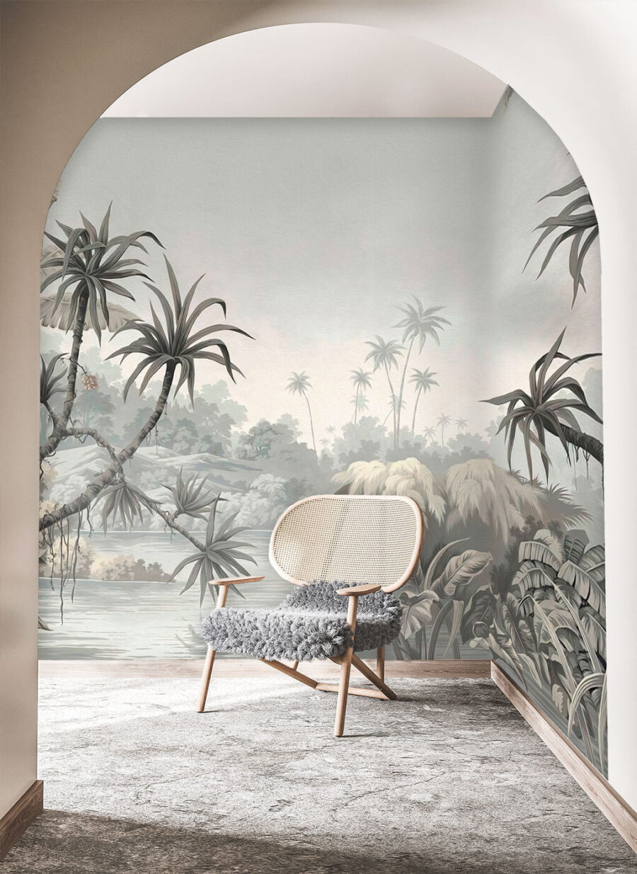 Képzelje el, hogy a nappalijában üldögél, és ahelyett, hogy az üres falakat bámulná, otthonában ebbe a nyugodt trópusi oázisba kerül. Ez a “Trópusi táj visszafogott tónusokban” című falfestmény olyan, mint egy friss levegővétel egy kis dzsungelrejtéllyel. Nem túl harsány, de mégis megragadja a sűrű lombok és egzotikus fák buja, zöld hangulatát.