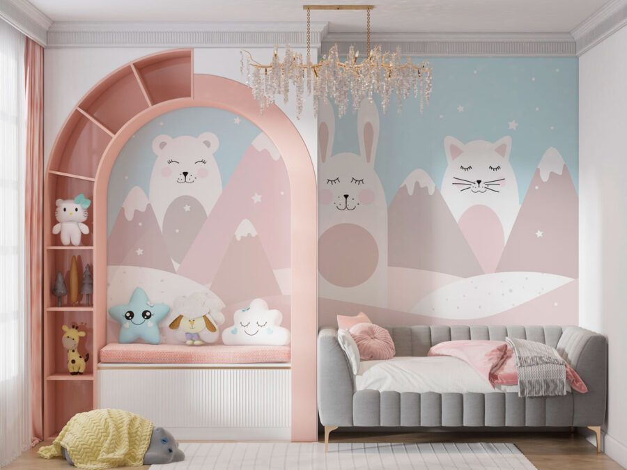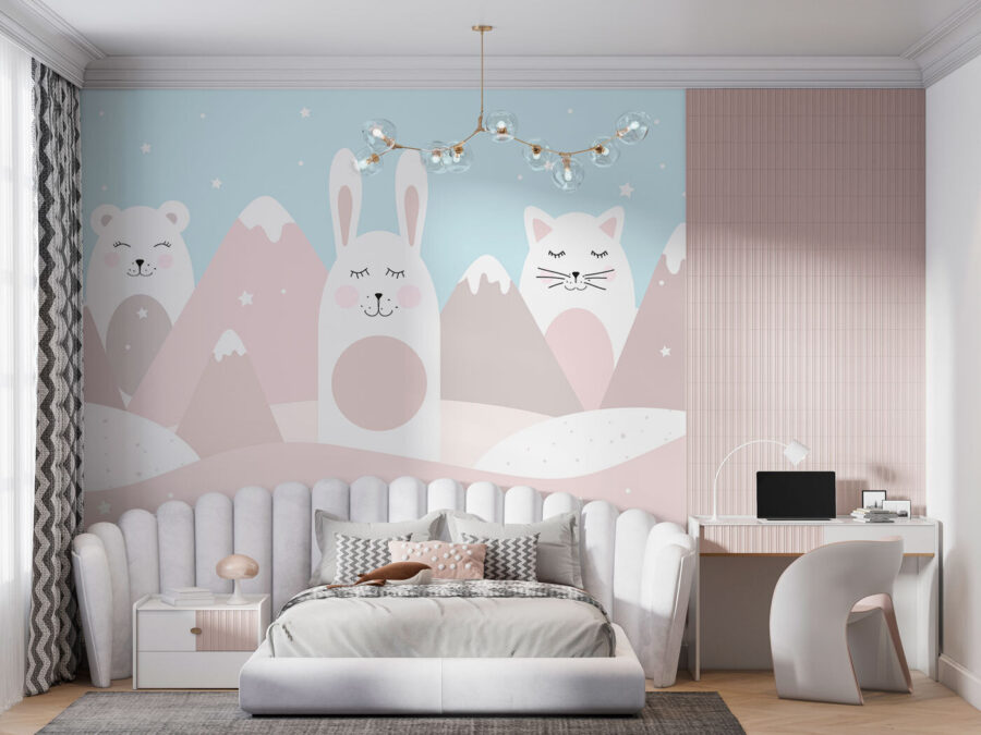 Képzelje el, hogy belép a gyerekszobába, és a legaranyosabb, legpasztellszínűbb, legnyugtatóbb színekben pompázó állatkák triója fogadja. Ez a szeszélyes falfestmény egy fehér, rózsaszín arcú macskát ábrázol, amely egy barátságos nyuszi és egy medve közé bújik, és mindannyian egy álomszerű, lágy hegyekből és csillogó csillagokból álló tájképen lógnak. Olyan, mintha egy esti mese elevenedne meg! Ez a falfestmény tökéletes minden kis felfedezőnek vagy állatbarátnak, hiszen egy csipetnyi varázslatot és egy cseppnyi örömet varázsol a térbe. A szelíd színek és az imádnivaló figurák biztosan édes álmokat és nagy kalandokat inspirálnak. A szülők imádják, mert olyan, mint egy békés, fantáziadús ölelés a szobába – ki ne szeretné ezt?