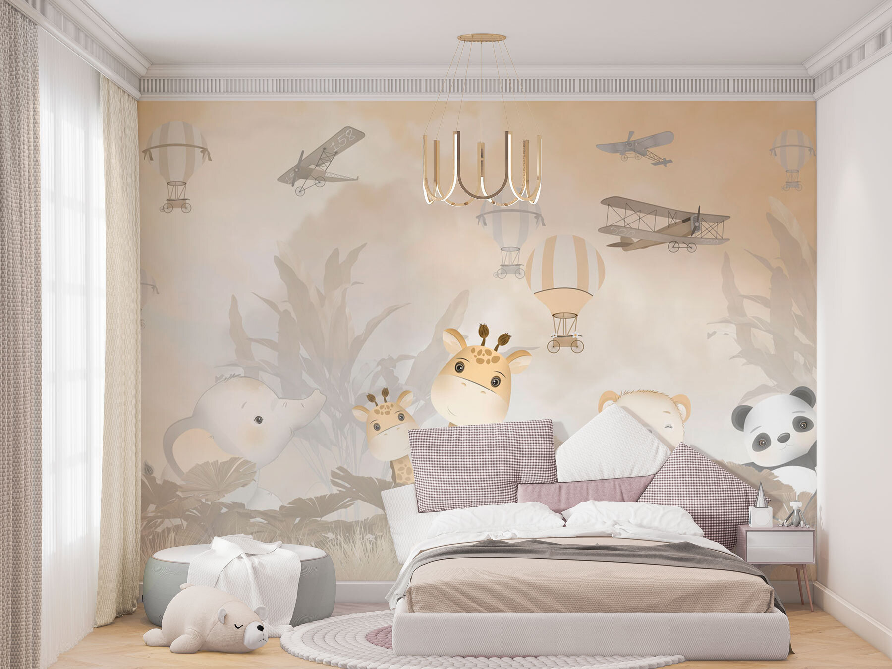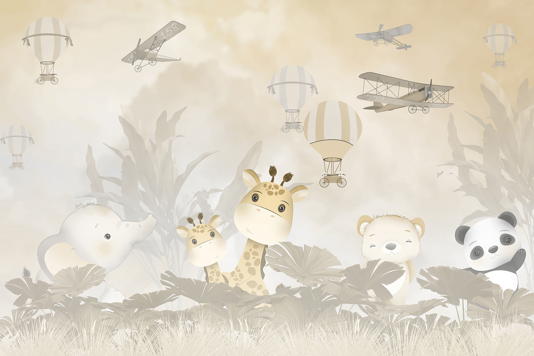 Ez a falfestmény fiúknak és lányoknak egyaránt tökéletes, hiszen a kaland és a csoda érzését kelti. A szelíd, visszafogott tónusok nyugodt kiegészítőjévé teszik anélkül, hogy túlterhelné a szobát. Képzelje el gyermekét, amint tágra nyílt szemmel kíváncsian néz felfelé, és talán meséket mesél magasan repülő kalandokról vagy szelíd elefántsétákról a léggömbökkel teli égbolt alatt.