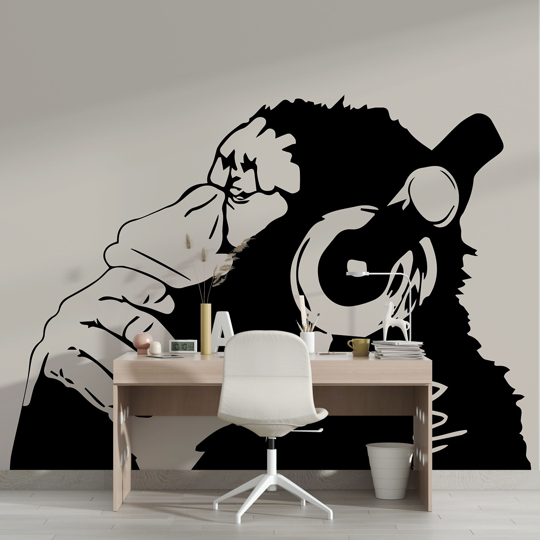 Van egy unalmas fala, aminek egy kis személyiségre van szüksége? Keltsd életre ezzel a “Majom fejhallgatót visel” falfestménnyel! Tökéletes, hogy bármilyen helyiséget feldobjon, legyen az gyerekszoba, játszószoba, vagy akár az otthoni irodája, ha kalandvágyónak érzi magát. Ez a pimasz majom egyszerűen érti – néha fel kell tekerni a zenét, és el kell veszni a saját világodban. Furcsa, modern, és mindenkit mosolyra fakaszt. Ismered azt az érzést, amikor a zene pont jó, és minden más elhalványul? Igen, ez a majom érti ezt. A falaid meg fogják köszönni!