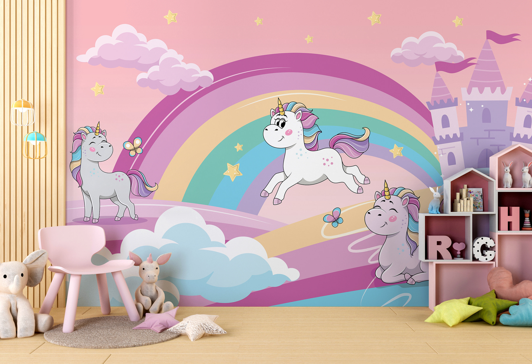 Alakíts át bármilyen hétköznapi szobát szeszélyes szabadulásra ezzel az imádnivaló egyszarvú falfestménnyel! Képzeld el a színes szivárványok körül táncoló pillangókat, miközben játékos egyszarvúak táncolnak a lágy rózsaszín ég alatt. Mintha egy mesekönyvbe lépnél, ahol a varázslat csak egy szívdobbanásnyira van. Ez a falfestmény tökéletesen beindítja a kisgyermek képzeletét, és otthonos, vidám hangulatot kölcsönöz, így minden napot kalandnak érezhetsz. Biztos, hogy mosolyt és kacagást, valamint egy cseppnyi örömet fog okozni minden alkalommal, amikor belépnek. Ki ne szeretne egy kis mesebeli varázslatot a falára?