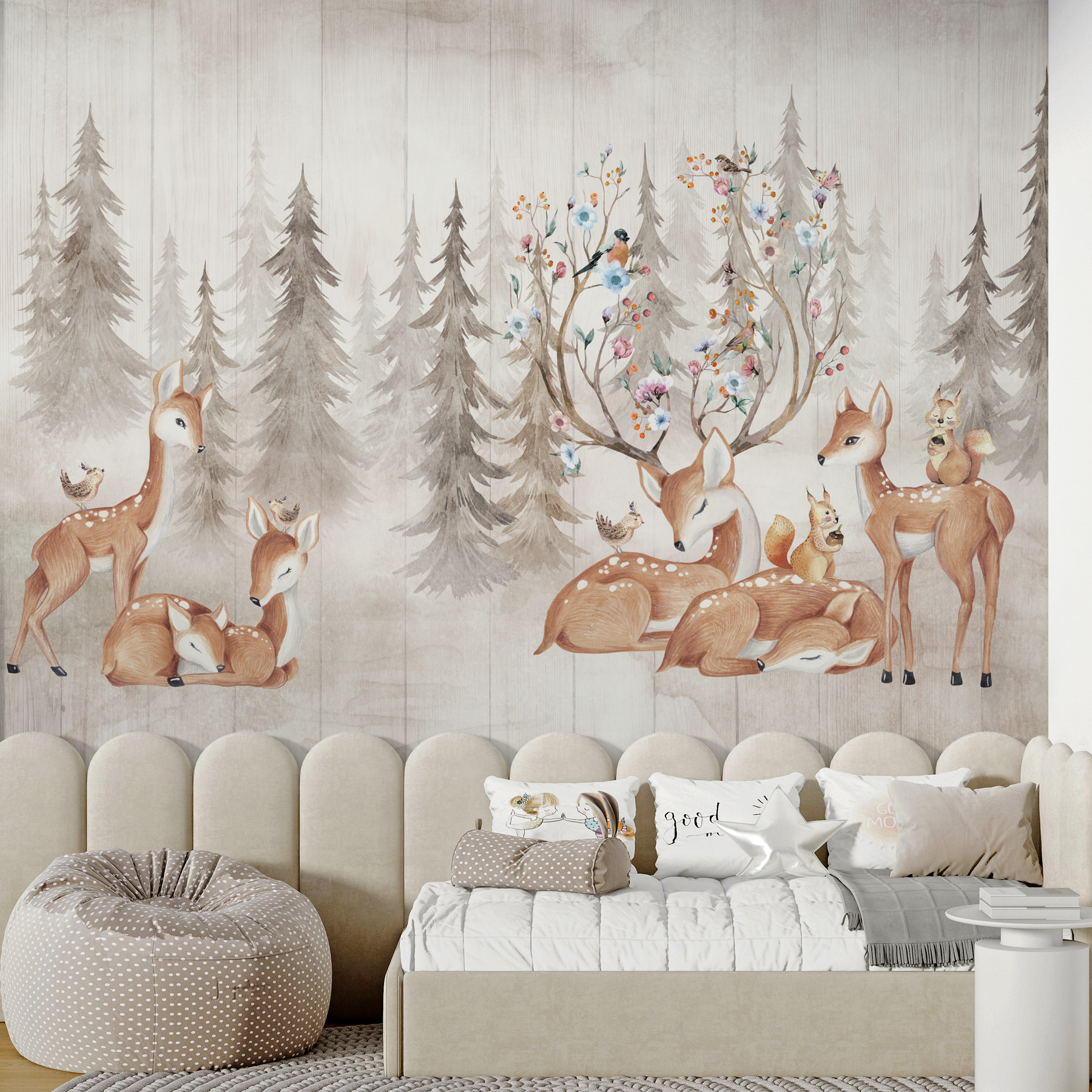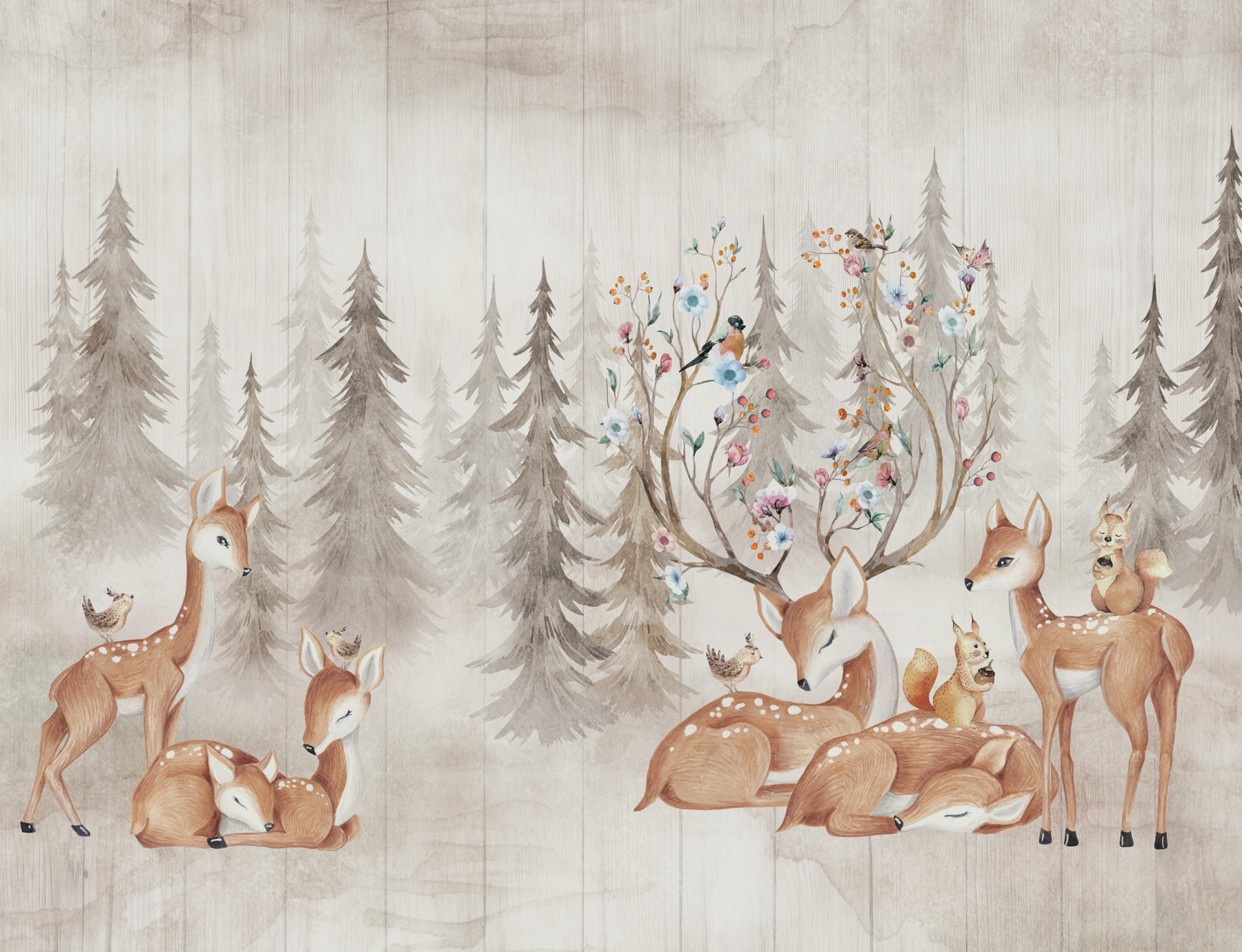 A tompa, földes tónusok zökkenőmentesen illeszkednek egymáshoz, meleg, természet ihlette hangulatot kölcsönözve anélkül, hogy elnyomnák a teret. A virágok bonyolult részletei és az egymásba fészkelődő nyugodt szarvasok bármelyik szobát nyugodt menedékké varázsolhatják. Szinte hallani a fák lágy susogását és a madarak halk csicsergését.