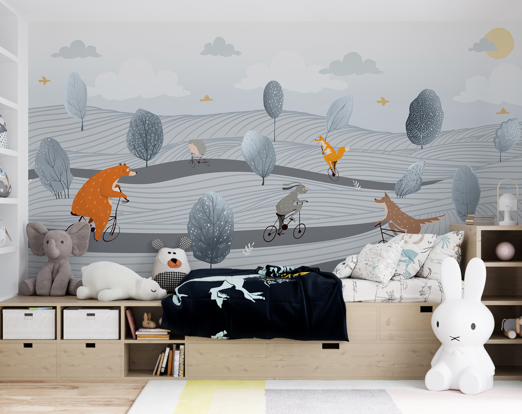 Alakíts át bármilyen teret ezzel a szeszélyes falfestménnyel, amely bájos, bicikliző állatok parádéját ábrázolja! Képzeld el, ahogy egy medve, egy róka és egy sün cirkál egy álomszép tájon. Olyan, mint egy jelenet egy bájos gyermekmesekönyvből, amely tökéletesen alkalmas arra, hogy mosolyt csaljon az arcokra és inspirálja a képzeletet. Legyen szó akár játszószobáról, gyerekszobáról, vagy csak a lakótér vidám felfrissítéséről, ez a falfestmény olyan játékos hangulatot kölcsönöz, amely feldobja a hangulatot. Gondolj rá úgy, mint egy barátságos társra a falakon, aki mindenkit meghív, hogy pattanjon fel erre a vidám kalandra. Ki ne örülne egy csipetnyi humornak és szeszélynek a mindennapokban?