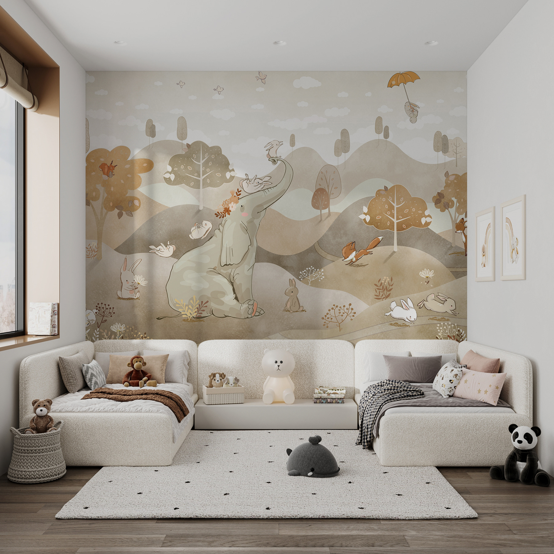 Alakítsa át a gyermek terét egy szeszélyes csodavilággá ezzel a bájos falfestménnyel, amelyen egy kedves róka látható barátságos erdei állatok között. Képzeld el, ahogy a kicsik szaladgálnak, kacagnak a játékos nyuszik és a bölcs elefánt láttán, miközben saját varázslatos történeteket álmodnak. A lágy színek nyugtató hangulatot teremtenek, amely tökéletes az esti mesékhez vagy a délutáni kalandokhoz. Olyan, mintha az elvarázsolt erdő egy darabját hoznád be a szobájukba! Ez a falfestmény nem csupán dekoráció; ez egy meghívás a képzeletre és az örömre, amely minden pillantásban kreativitást ébreszt.