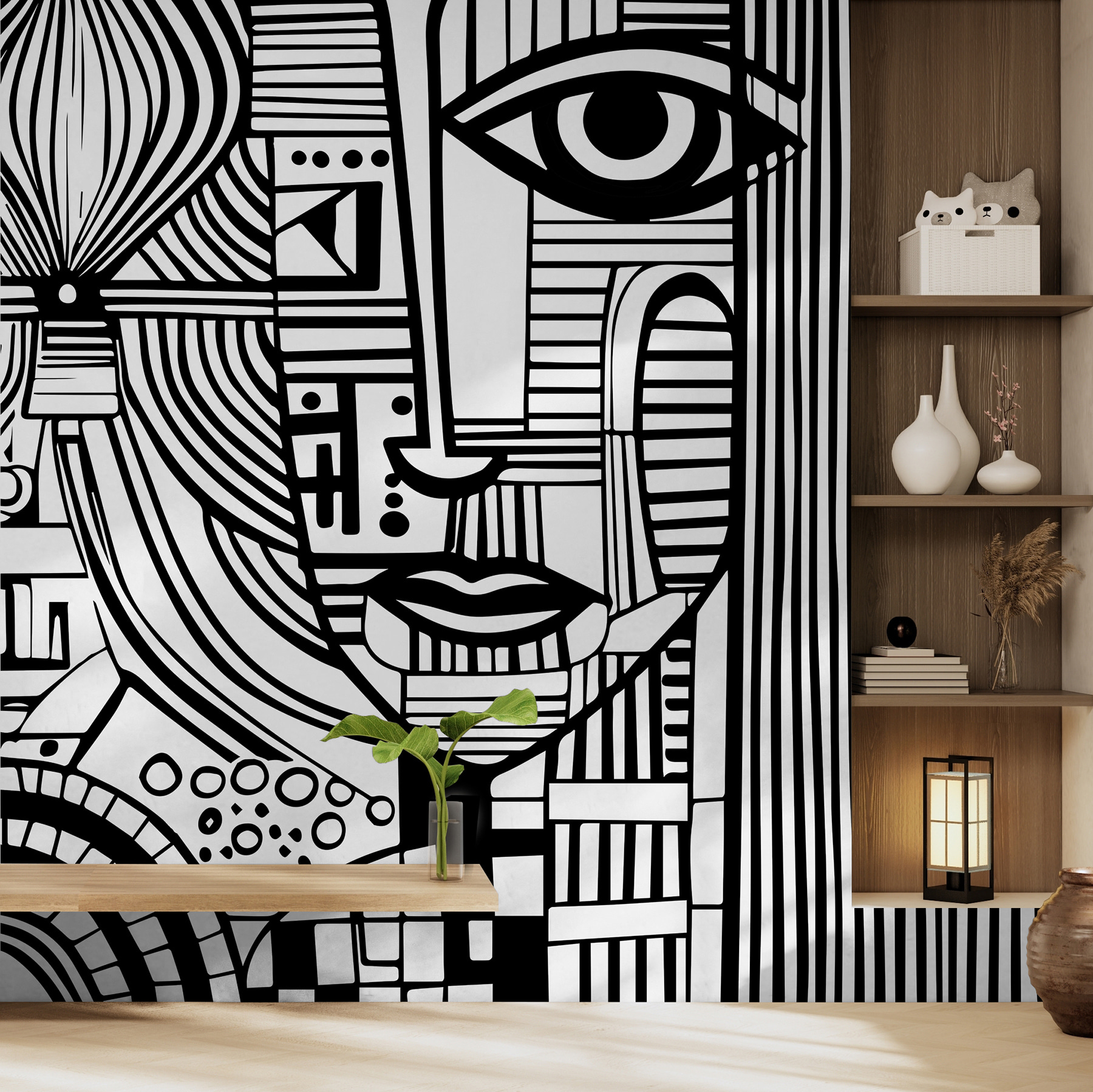 Gondolkodik azon, hogy a falának komoly stíluspontokat adjon? Nézze meg ezt a fekete-fehér falfestményt – mintha a művészet találkozott volna az eleganciával, és ez a lenyűgöző kép született volna. Egy női arcot ábrázol egy modern, absztrakt rajzban, amely egyszerre merész és bonyolult. Képzeld el, hogy hazaérsz, és ezt látod a faladon – totális showstopper, igaz? A klasszikus monokróm és az éles dizájn kombinációja. Tökéletes azok számára, akik egy kis “wow”-t szeretnének varázsolni a terükbe. Legyen szó nappaliról, hálószobáról vagy akár irodáról, ez a falfestmény bármilyen helyet művészi paradicsommá varázsolhat. És komolyan, ez nem csak egy tapéta, ez egy központi elem, egy beszélgetésindító. A részletes vonalak és formák akár arra is meghívhatják, hogy minden egyes alkalommal, amikor ránéz, új szempontokat találjon. Ez az a fajta dekoráció, ami miatt a vendégek azt kérdezik: “Ezt meg honnan szerezted?”! Ideális egy egyedülállóan stílusos háttér megteremtéséhez anélkül, hogy minden mást elnyomna. Miért érné be tehát egyszerű falakkal, ha lehet egy remekműve is?