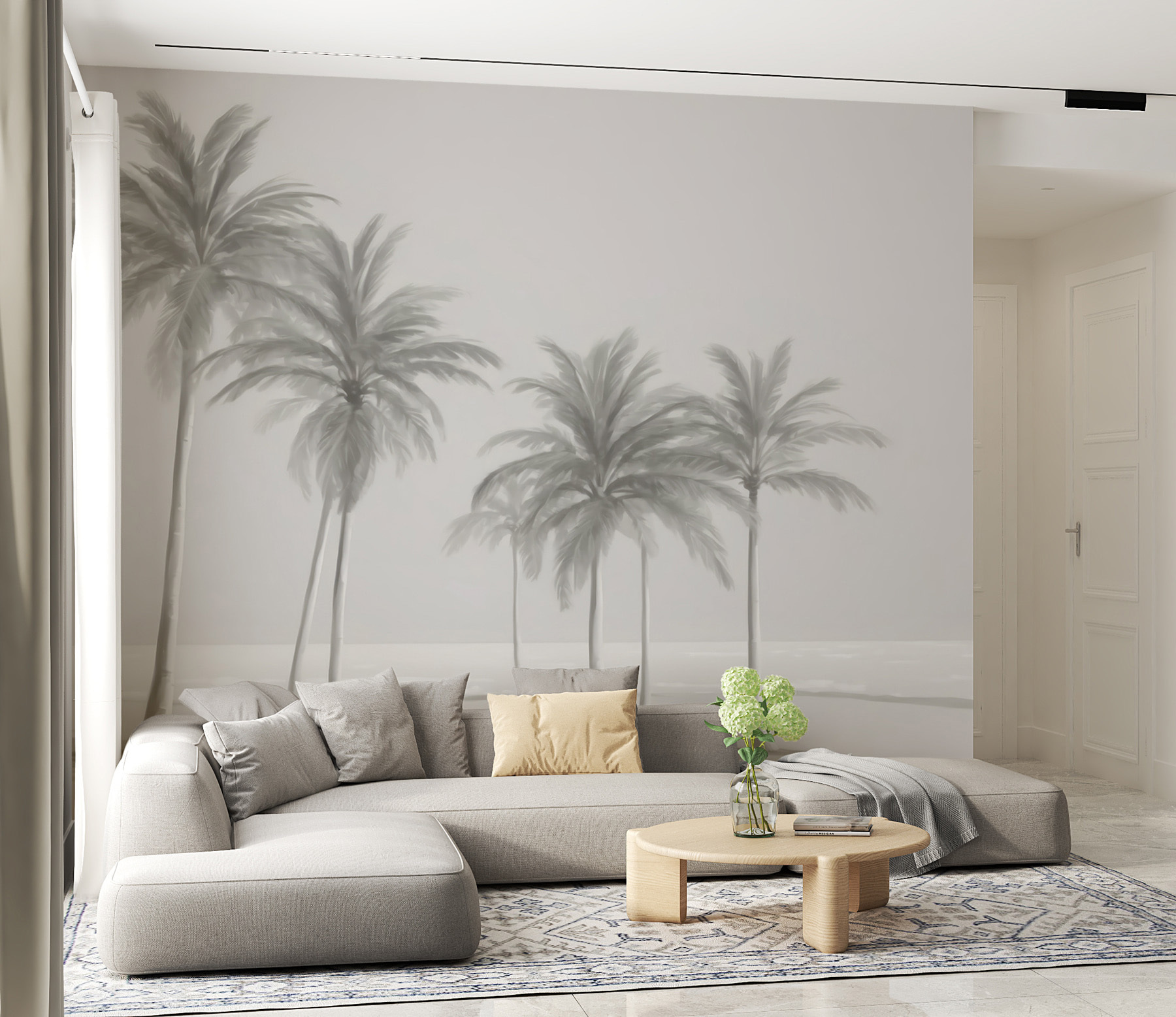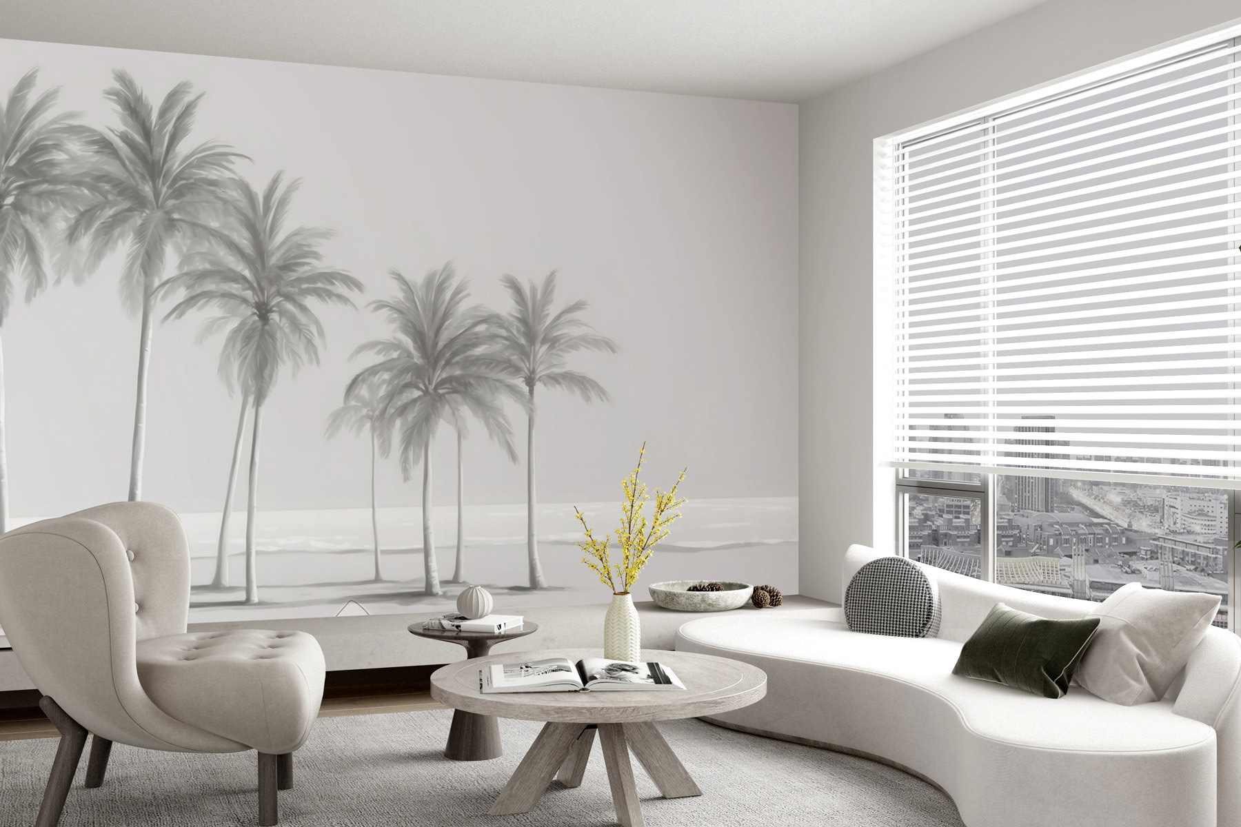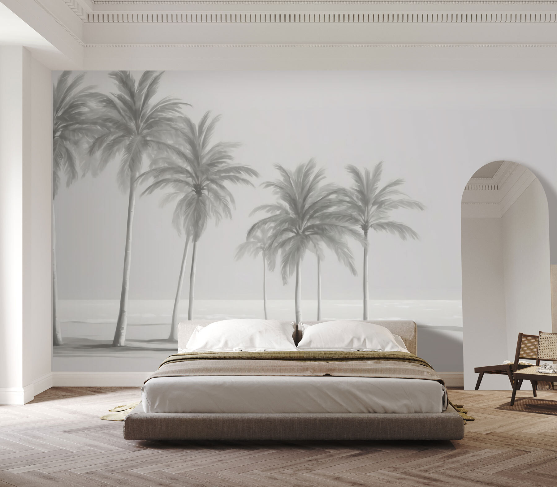 Ez a falfestmény egy jelenetet ábrázol, amelyen több magas, elegáns pálmafa lágyan ringatózik, mintha egy tengerparti szellő érintené. A lágy, tompa színek szinte álomszerűvé teszik a képet, kicsit olyan, mint egy vintage fotó, amely egy nyugodt napot örökít meg a parton. Bármilyen dekorációhoz illik – modern, boho, amit csak akarsz. Ráadásul szuper megnyugtató; az a fajta látvány, amitől azonnal kifújod magad.