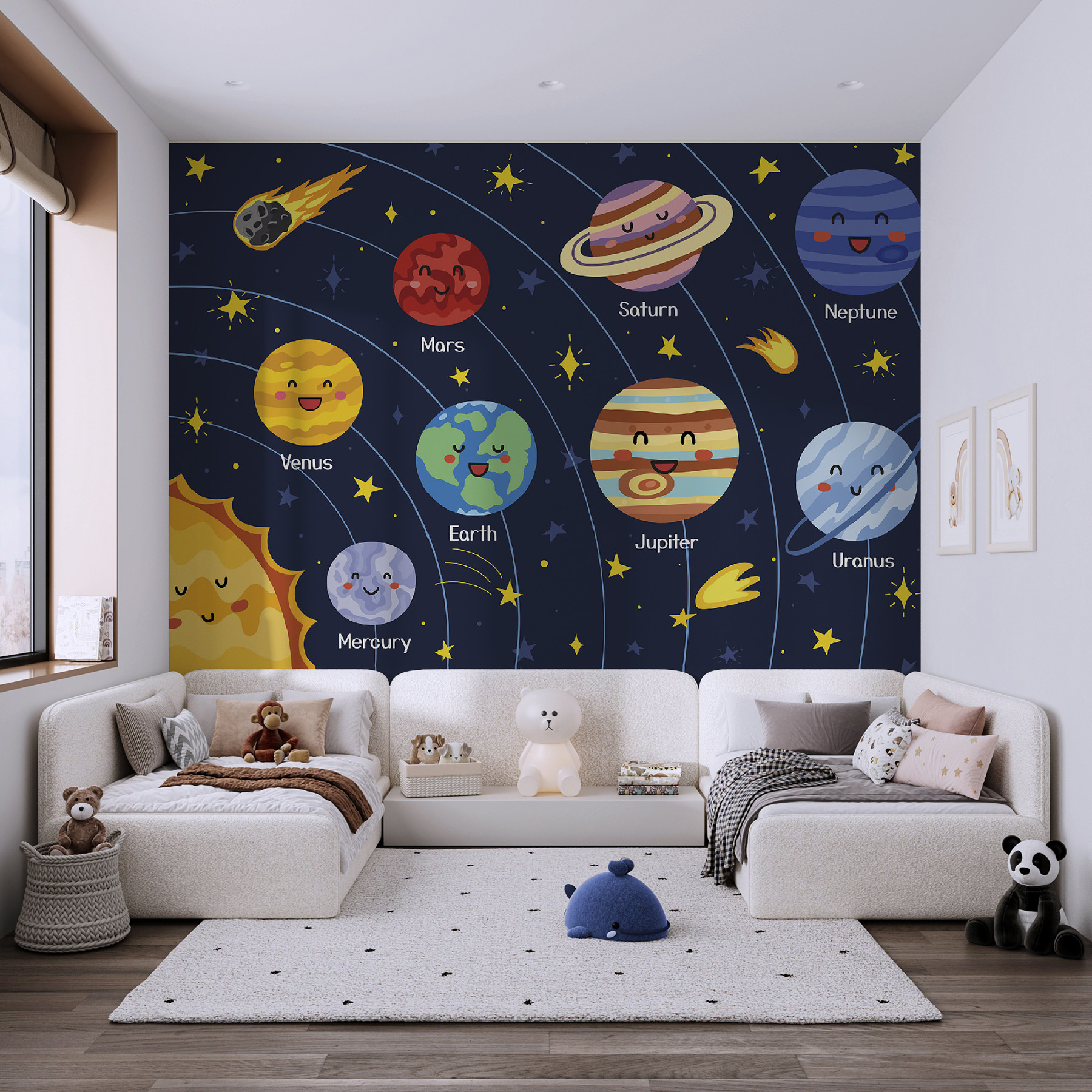 Szeretné feldobni a gyerekszobát egy kis világon kívüli bájjal? Nézd meg ezt az imádnivaló “Cartoon of a Planet” falfestményt! Tökéletes a kis űrhajósok és csillagászok számára, mivel egy vidám és színes galaxis jelenetet ábrázol. A bolygóknak a legaranyosabb arcuk van – szinte pacsira kérnek. Képzeld el, ahogy gyermeked arca felragyog, miközben egy teljesen saját univerzumban alszik el.