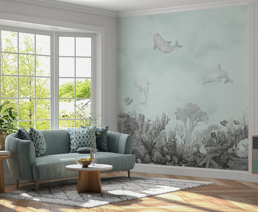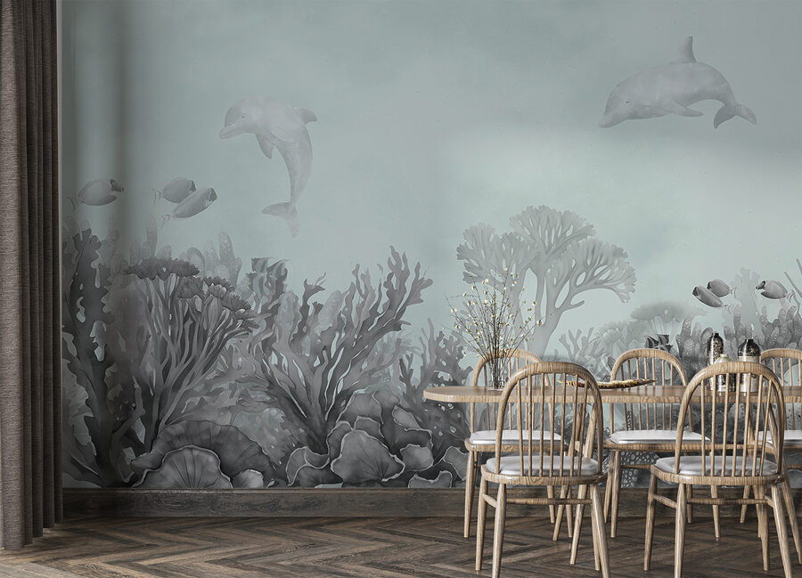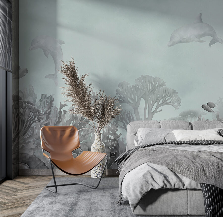 Delfinek a falon? Igen, kérem! Van valami igazán varázslatos ebben a “falra festett delfin” falfestményben. Képzeld el, hogy felpillantasz, és úgy érzed, mintha a víz alatt lennél, anélkül, hogy a vizes hajaddal bajlódnál. A játékos delfinek és a vibráló korallzátonyok az óceánt egyenesen a nappalidba, hálószobádba vagy akár egy gyerek játszószobába hozzák. Tökéletes az állatok szerelmeseinek, a tengerpart szerelmeseinek, vagy bárkinek, aki tengerparti menekülésről álmodik. Bármilyen térbe vidámságot és szeszélyességet visz, élénk és friss érzést kölcsönöz. Ráadásul remekül beindítja a fantáziát – a gyerekek egyszerűen imádni fogják. Olyan, mintha lenne egy személyes akváriumuk, amelyet soha nem kell etetni!