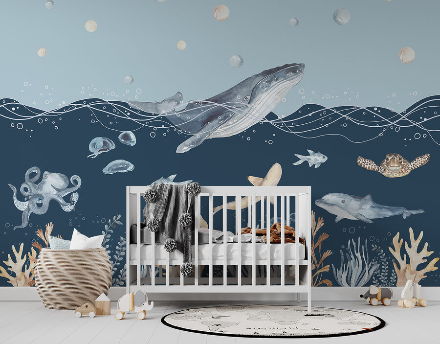 Képzelje el, hogy szobáját víz alatti csodavilággá változtatja a “Bálna akvarellje” falfestmény segítségével. A nyugodt kékek és játékos tengeri lények gyönyörű keveréke, amely tökéletesen alkalmas arra, hogy varázslatos hangulatot kölcsönözzön bármely helyiségnek. Legyen szó akár gyerekszobáról, gyerekszobáról, vagy csak azért, mert szereted az óceánt, ez a falfestmény mindenre megfelel.