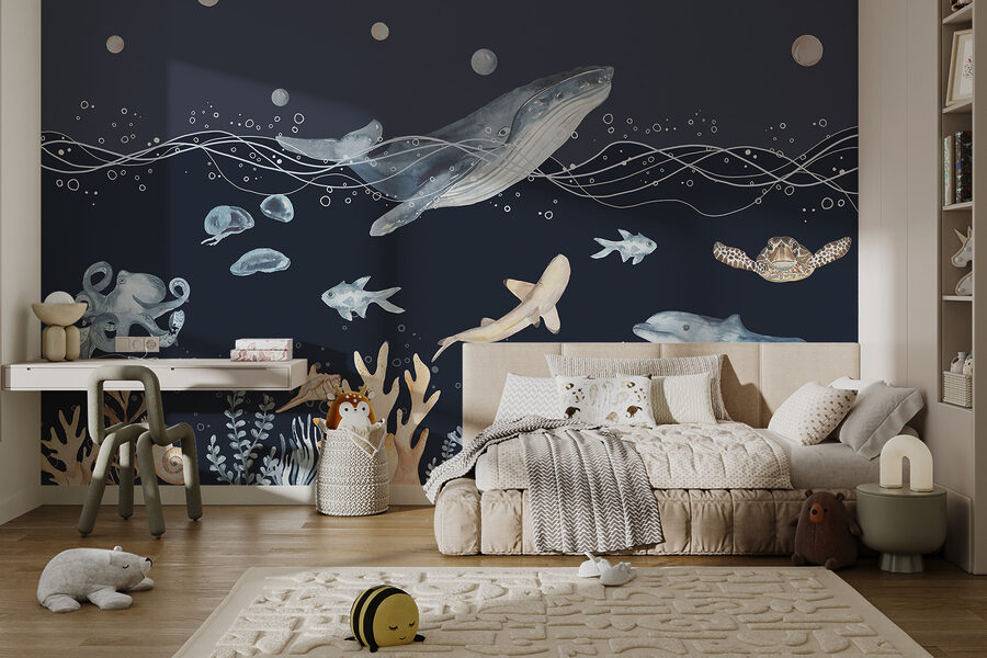 Képzelje el ezt: egy hangulatos szoba egy szeszélyes óceáni jelenettel a falon, mintha minden nap egy víz alatti kalandba merülne! A “Fotótapéta Whale Swimming in the Water” (Bálna úszik a vízben) fali falfestmény nyugodt, vízi hangulatot hoz bármely térbe, tökéletes a gyerekek vagy a fiatalabbak számára. Van benne minden – egy játékos bálna, kíváncsi delfinek, sőt még egy koralloktól és tengeri élőlényektől hemzsegő óceánfenék is.