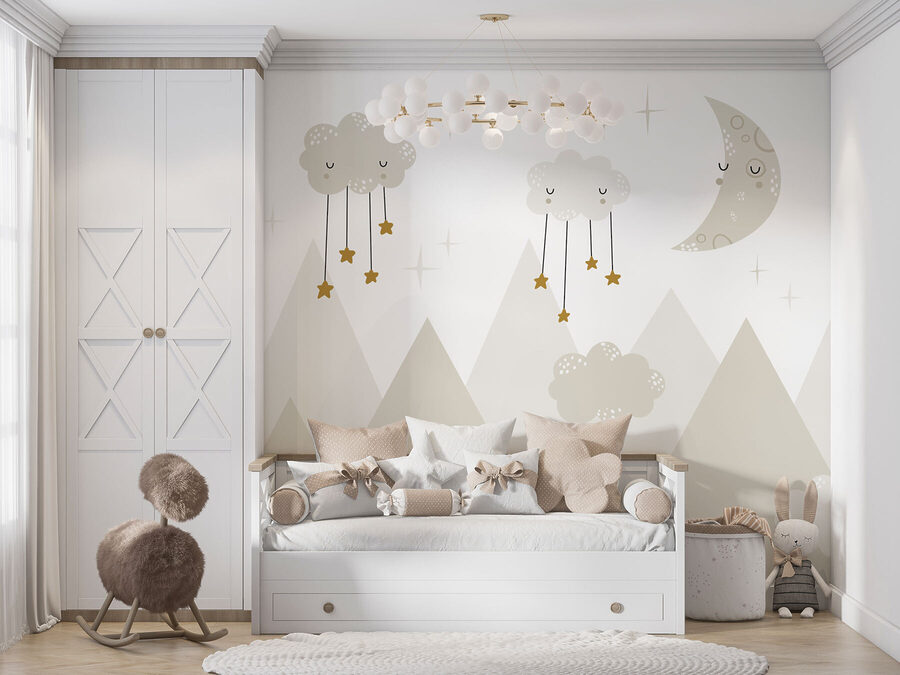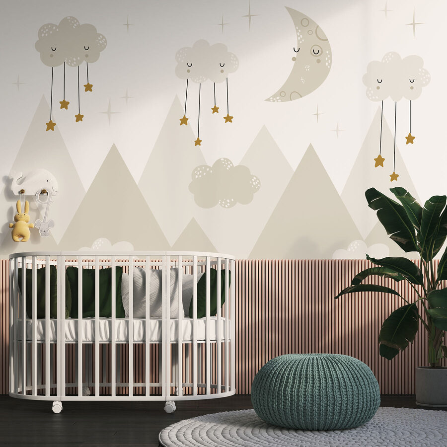 Képzelje el ezt: egy álmodozó éjszakai égbolt freskó álmos holddal és hangulatos felhőkkel, amelyeken csillagok lógnak, és gyengéden ragyognak a hegycsúcsok felett. Mintha egy szeszélyes esti mesébe csöppennél! Tökéletes gyerekszobába vagy gyerekszobába, ez a falfestmény ötvözi a képzeletet és a kényelmet – felpezsdíti a kicsik kreativitását, miközben megnyugtató hangulatot teremt. Gondolj az édes álmokra és a lefekvés előtti kacagásra. Ráadásul ki ne szeretne elaludni egy ilyen elbűvölő és nyugtató jelenet alatt? Ez több mint egyszerű dekoráció – ez egy apró kaland, közvetlenül a falon.
