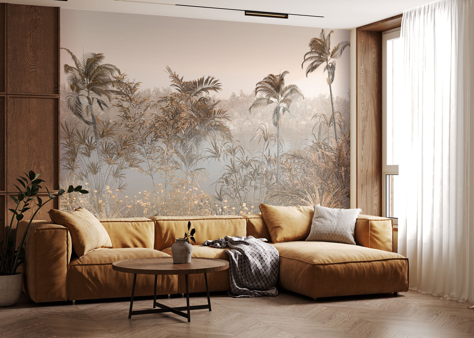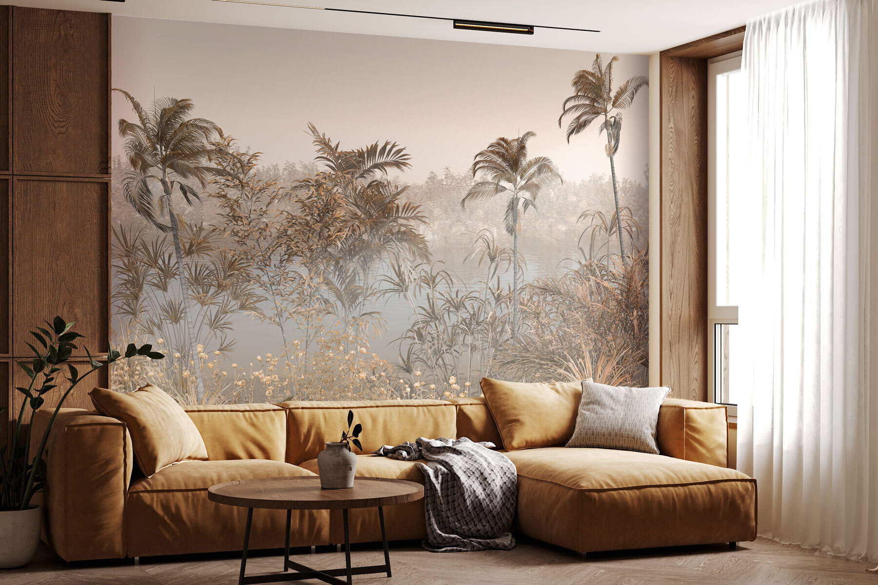 Képzelje el, hogy minden alkalommal, amikor belép a szobába, egy nyugodt vízparti oázisba kerül. Pontosan ezt kapod a “Falfestmények Pálmafa egy víztest mellett” című szobával. Olyan, mintha kókuszvizet kortyolgatnál egy kis csendes elmélkedéssel. Ez a falfestmény tökéletesen alkalmas arra, hogy az anyatermészetet a belső térbe hozza, és minden a nyugtató hangulatról szól – lágyan ringatózó pálmafák, az eget tükröző víztömeg, és egy békés környezet, amely álmodozásra hív. Ez a természet ihlette dekoráció és az érzékek kis elvonulása édes pontján van. Képzelje el, hogy olyan térbe lép, ahol mindig szellősnek és könnyednek érzi magát – még a stresszes napokon is. És hé, ha jól hunyorítasz, talán hallod a pálmalevelek susogását és érzed a hűvös szellőt.