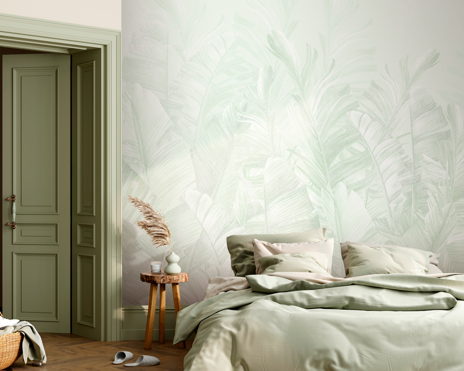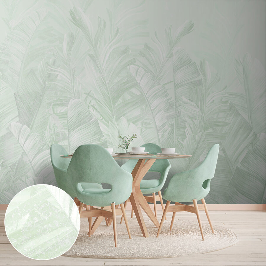 Íme egy falfestmény, amely friss, mentolos levegőt lehel a helyiségedbe! Ez a “Mintás levelek mintája” dizájn olyan, mint a trópusok szelíd suttogása. Képzeld el, hogy minden reggel felébredsz, és úgy érzed, mintha egy buja, nyugtató dzsungelben lennél. A lágy menta árnyalatai könnyedén szemet gyönyörködtetőek, és tökéletesek egy mozgalmas nap után a megnyugváshoz.