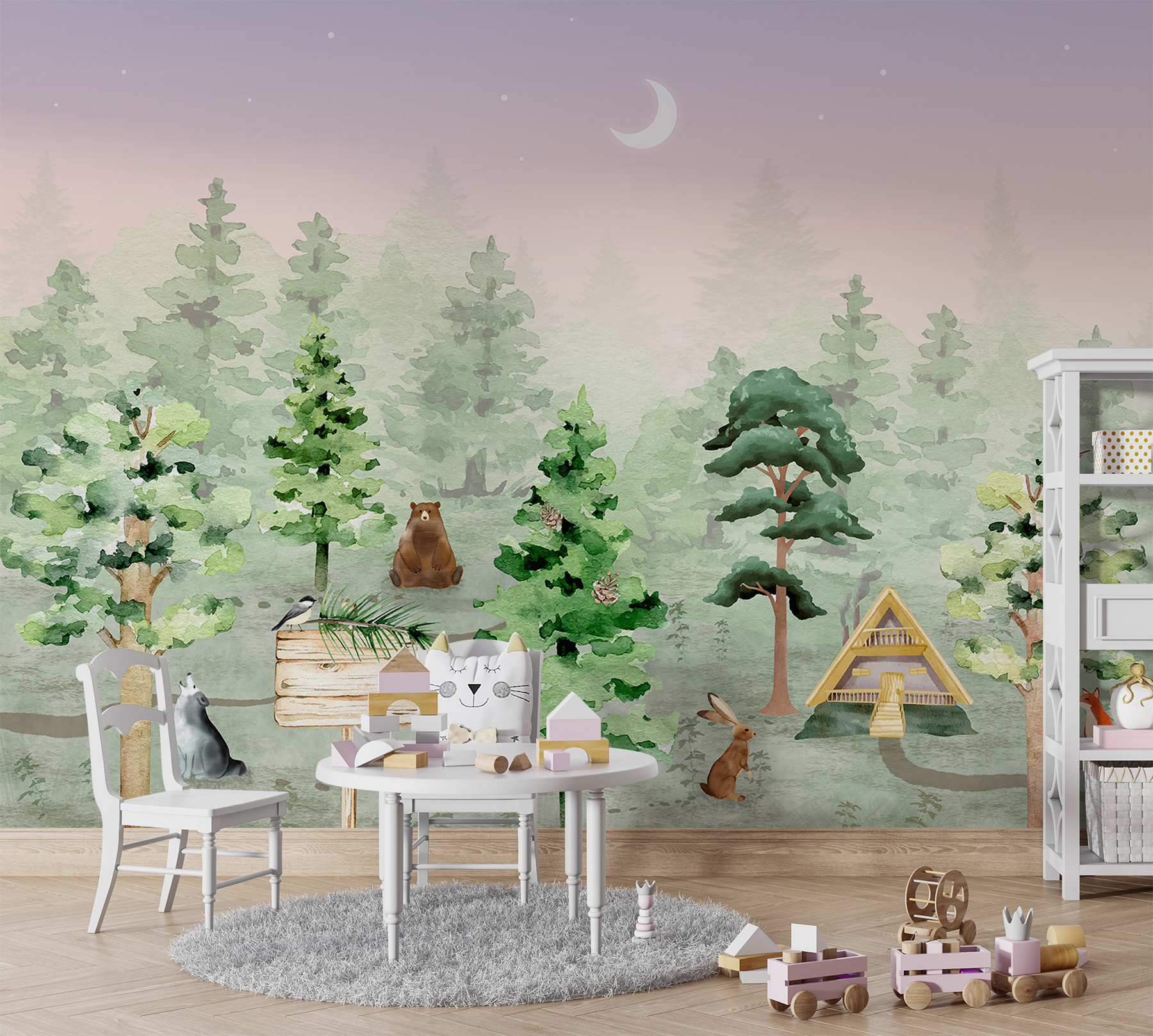 Képzelj el egy varázslatos erdőt az otthonodban – ez a kedves falfestmény egy aranyos madarat ábrázol, amely egy fából készült táblán ül, és egy szeszélyes erdei jelenetbe invitál. Állati barátok gyűlnek köré, mindegyikük egy kis bájt és kalandot adva hozzá. Tökéletes gyerekszobákba, olyan, mintha minden nap egy szeretett mesekönyvbe lépnél be. A lágy, nyugtató színeknek köszönhetően az állatok barátságos társaknak tűnnek. A gyerekek imádni fogják a rókát, a nyulat és a bölcs öreg medvét, miközben álomba szenderülnek. A holdfény varázslatos hangulatot kölcsönöz, így az alvásidő még varázslatosabbá válik. Ez nem csak egy falfestmény, hanem egy utazás egy álomszerű erdőbe, amely a képzeletet és a természet szeretetét ébreszti fel a fiatal szívekben. Ki ne szeretné ezt a kis csodadarabot a falán?