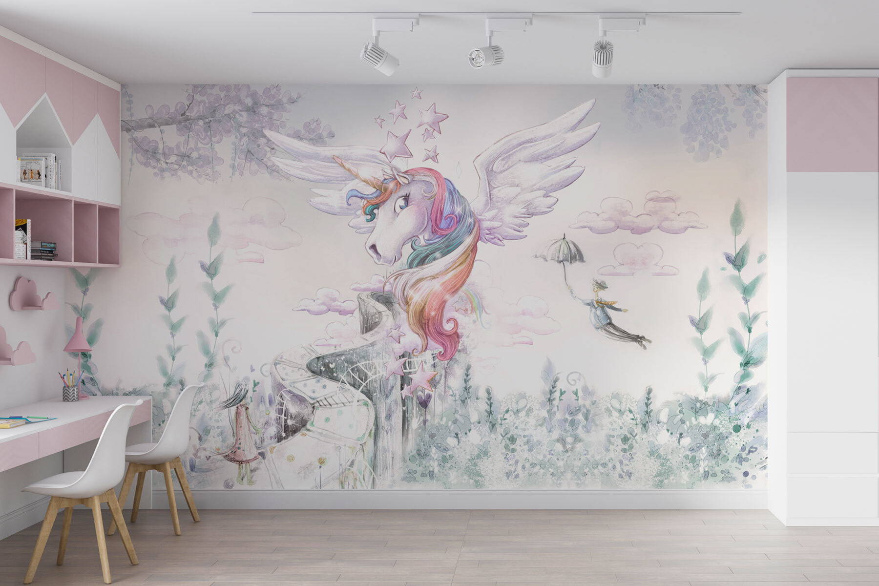 Egy kis varázslatot keresel gyermeked szobájába? Nézd meg ezt a “Szárnyas egyszarvú szárnyakkal és szivárványhajjal” falfestményt! Képzeld el, hogy egy mesebeli jelenetre ébredsz – egy szeszélyes egyszarvú, pasztellszínű szivárványhajjal, lágy felhőkkel és csillogó csillagokkal körülvéve. Mintha minden gyermek álma lenne, a falra festve! Ez a falfestmény gyönyörűen illeszkedik a gyerekszobákba és a kisgyermekek szobáiba, olyan érzést keltve, mintha kedvenc mesekönyvükbe ugrottak volna. Édesen visszafogott, mégis teljesen elbűvölő – örömet és végtelen történeteket szít. Tökéletes a kicsik csodavilágába vagy bármelyik egyszarvú-rajongó menedékébe! 🌈🦄