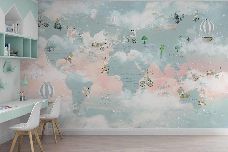 Ez a “Világtérkép felhőkkel és állatokkal” falfestmény nem egy tipikus fali dekoráció – ez egy szeszélyes kaland, amely arra vár, hogy kibontakozzon! Tökéletes a kis felfedezők és álmodozók számára, lágy pasztellszínű térképet ábrázol bájos állatillusztrációkkal és pelyhes felhőkkel. Képzelje el, ahogy csecsemője vagy kisgyermeke ezt a falfestményt bámulja, és képzeletbeli utazásra indul Észak-Amerikától Afrikáig, kíváncsi kis állatkákkal az útitársaik között.